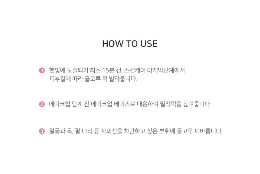 1️⃣ Apply evenly at the last step of your skincare routine, at least 15 minutes before sun exposure.