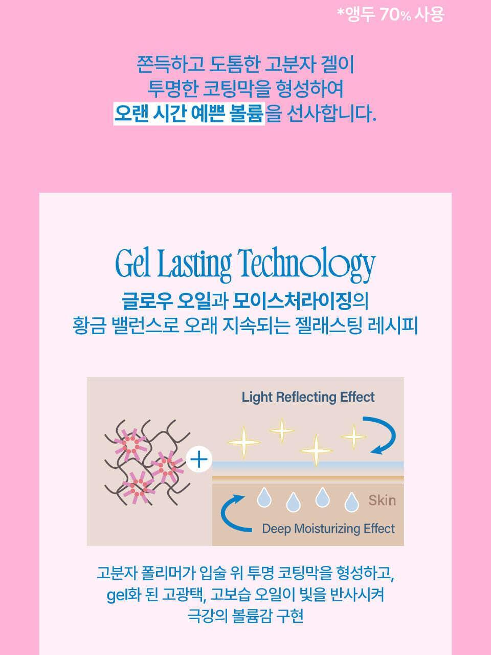 - High Molecular Polymer & Ultra Hydrating Oil: This combination not only provides a spectacular gel glow but also retains moisture, ensuring your lips remain hydrated and voluminous.