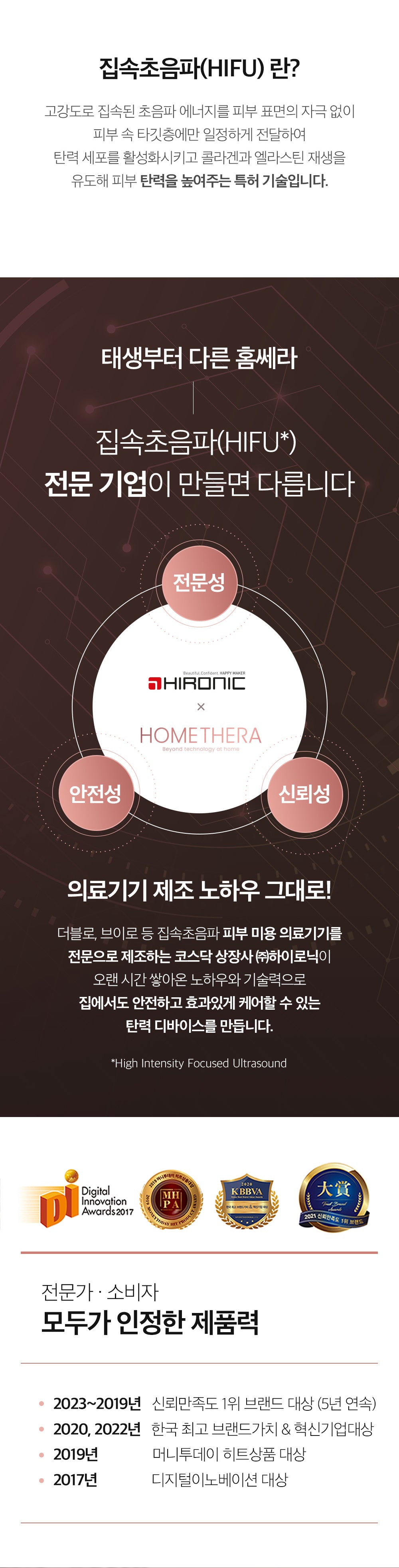 HOMETHERA is crafted by Hyronik, a KOSDAQ-listed company known for its expertise in manufacturing HIFU-based aesthetic devices like ‘DOUBLO’ and ‘VRO’. Enjoy professional-grade care at home with a device built on years of medical manufacturing experience.