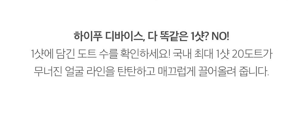 Unlike other HIFU devices, HOMETHERA delivers 20 tightly packed dots per shot — the highest in the market — to lift and firm sagging facial contours effectively.