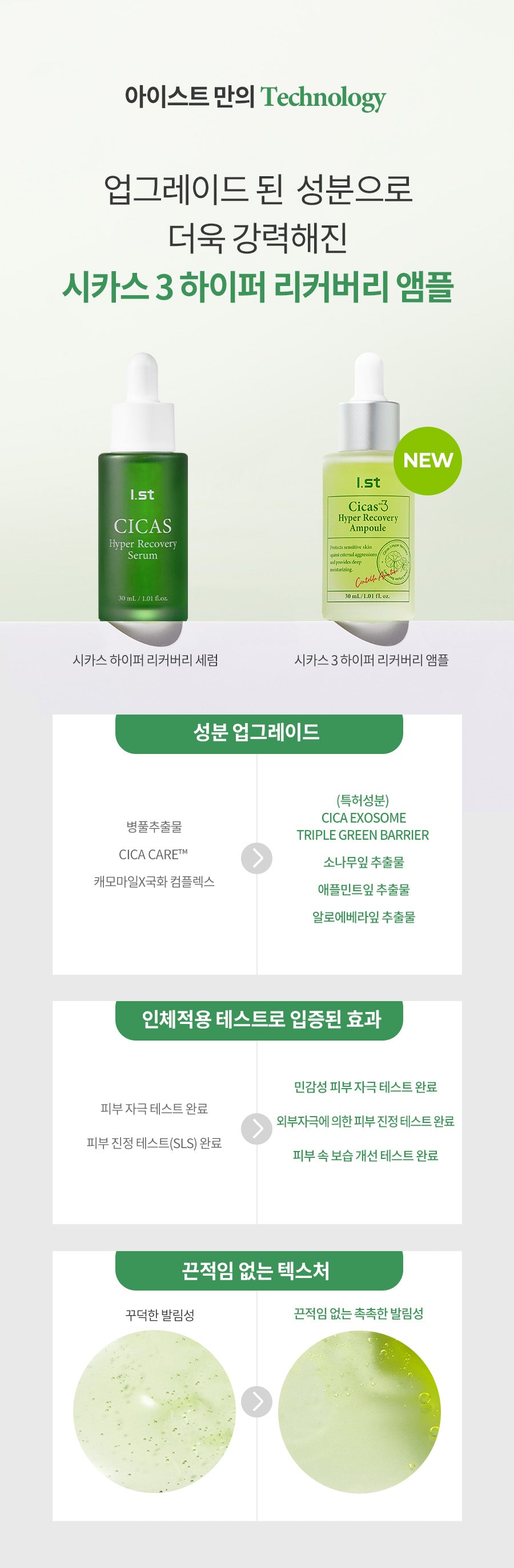 I recently tried the I.st Cicas 3 Hyper Recovery Ampoule and was thoroughly impressed with its performance. This ampoule boasts advanced formulations that focus on soothing sensitive skin, which is exactly what I needed. Within just one day of use, my irritated patches calmed significantly, and it provided deep hydration without feeling heavy or greasy. The clinically proven results really speak volumes; my skin looked plumper and healthier after a week of consistent application.