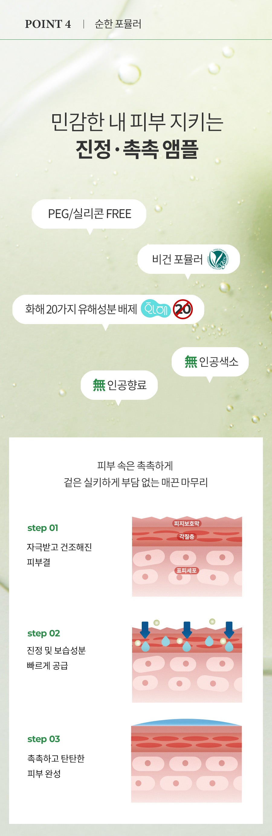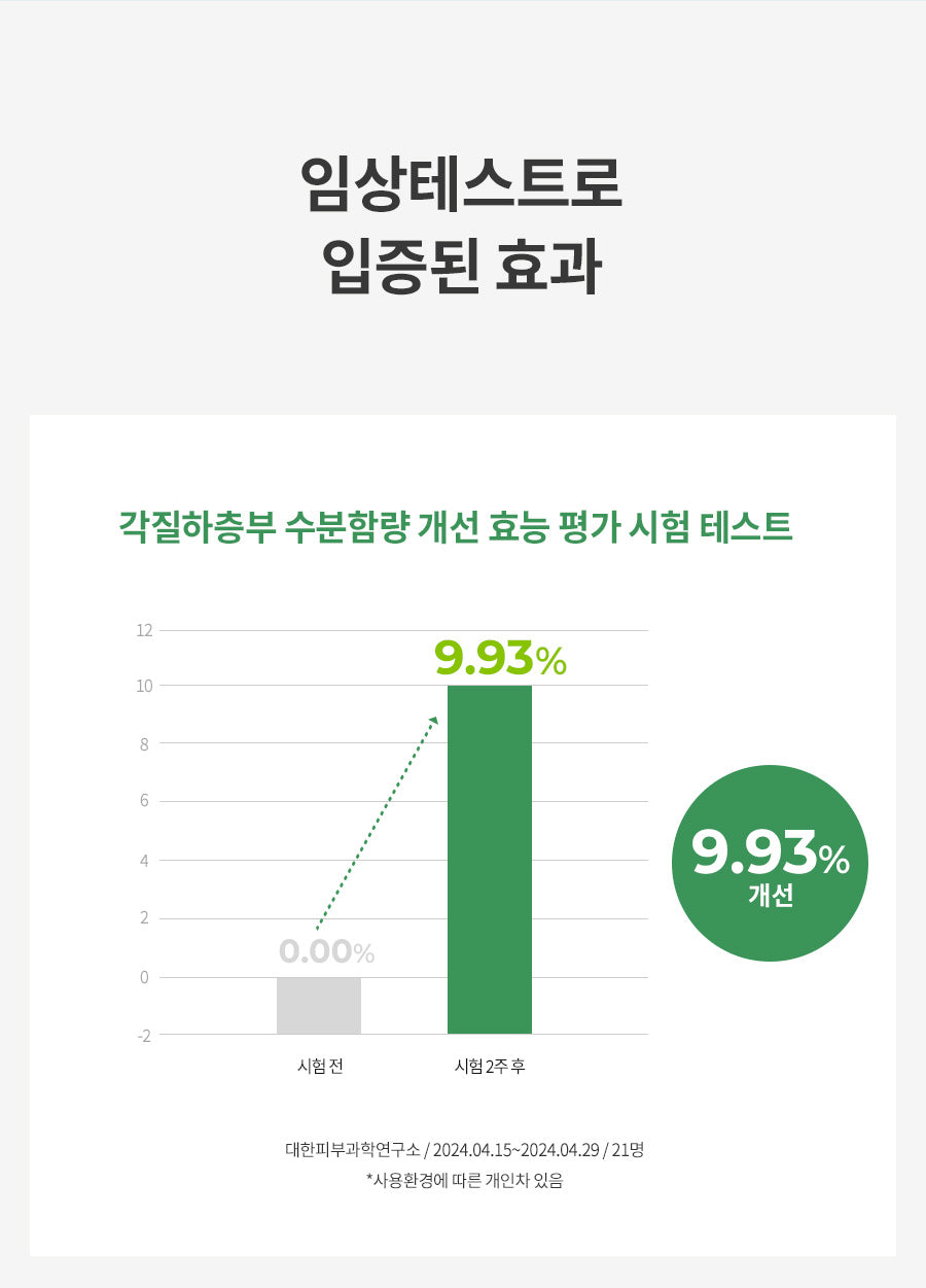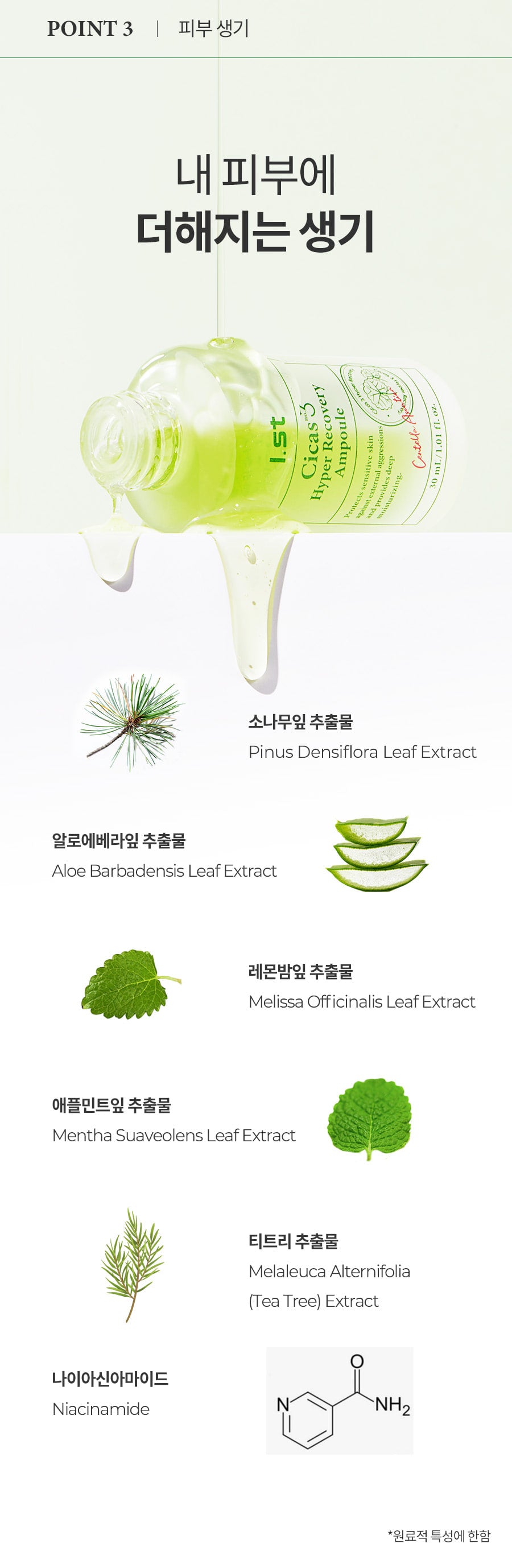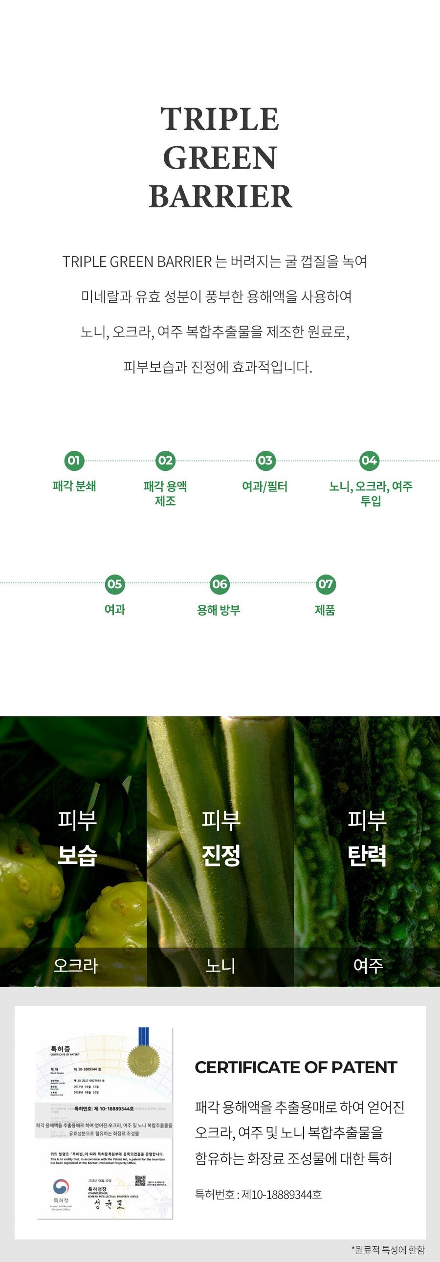 - Triple Green Barrier: A patented complex extract (Patent 10-18889344) made from noni, okra, and yam, rich in minerals to improve moisture retention and protect the skin.