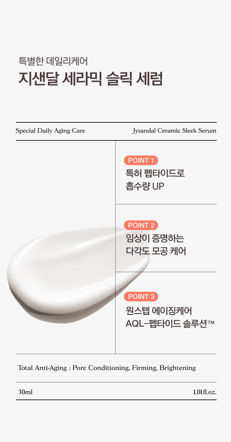 Jysandal Ceramic Sleek Serum is designed to combat visible signs of aging and restore skin balance affected by external stressors. Infused with AQL-Peptide Solution™, this serum delivers targeted care to help improve skin elasticity, texture, and overall resilience.