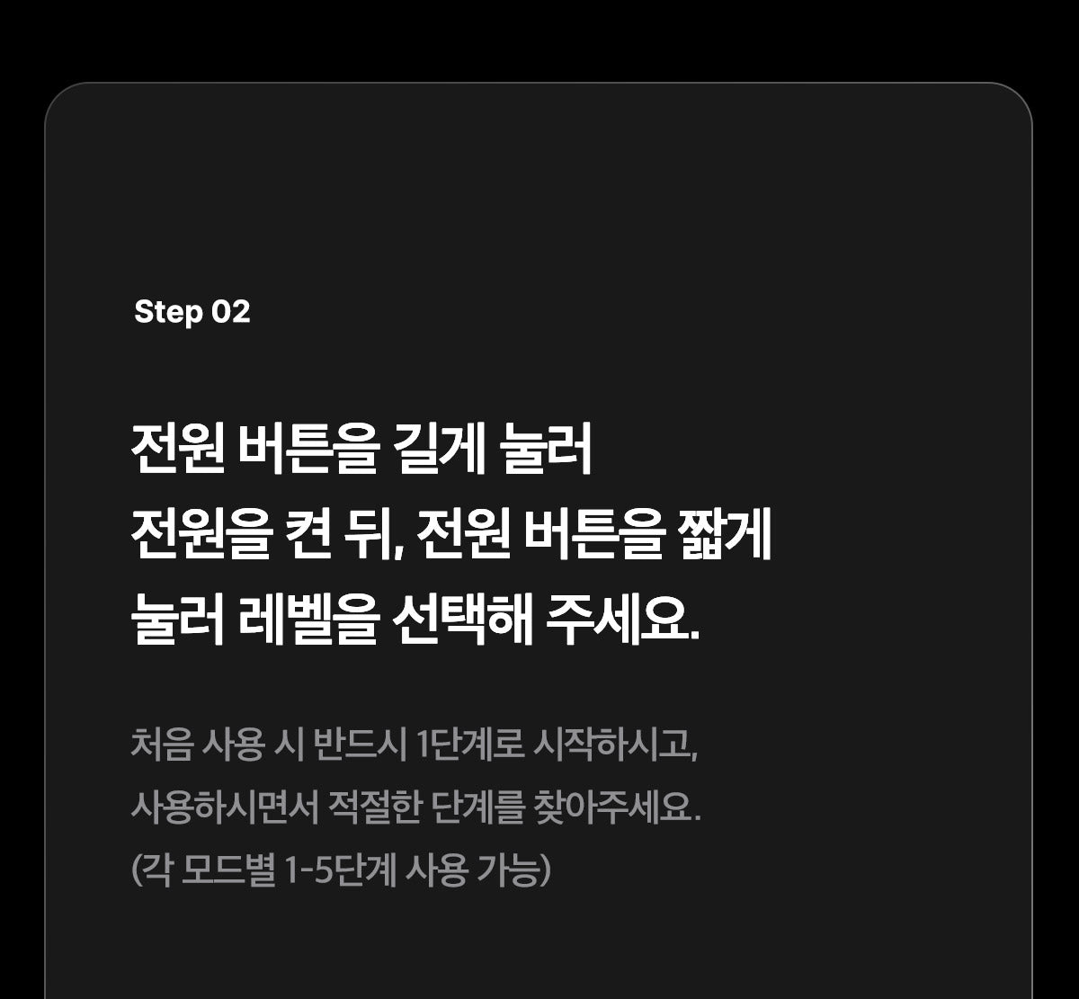 - Post-Care Sensation: Temporary heat and redness may occur but will naturally subside. For sensitive skin or excessive redness, use a lower level and a soothing pack after use.