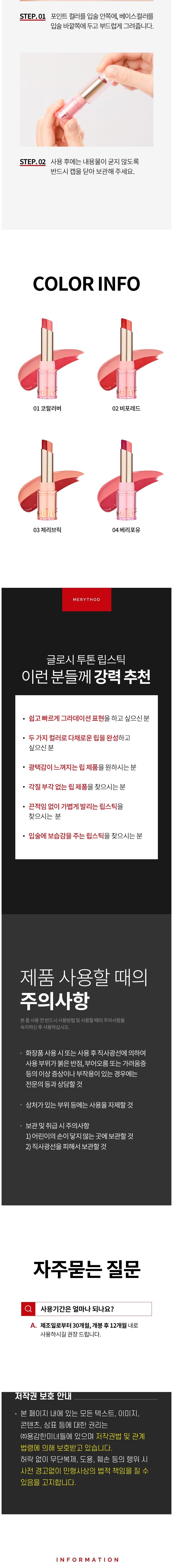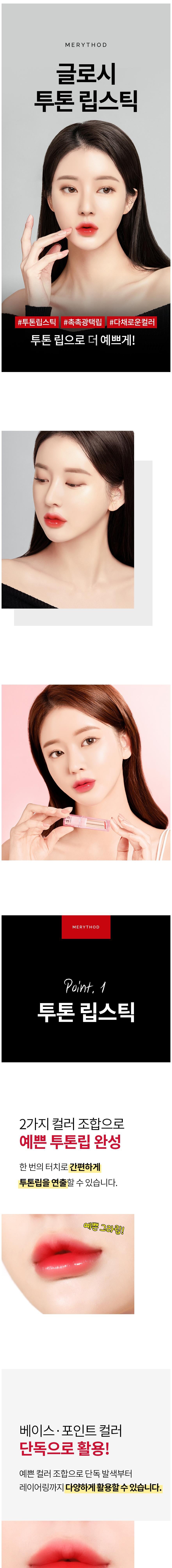 I’ve recently tried the MERYTHOD Glossy two-tone lipstick and was genuinely impressed by its performance. The unique feature of being able to use either the base or point color separately provides versatility for various looks, whether I want a subtle hint or vibrant pop. The formula glides smoothly onto my lips without any dryness, thanks to its nourishing ingredients that keep them moisturized throughout the day. Additionally, it has superb spreadability; there’s no patchiness at all. Overall, it’s become a staple in my makeup bag due to both its aesthetics and lip care benefits.