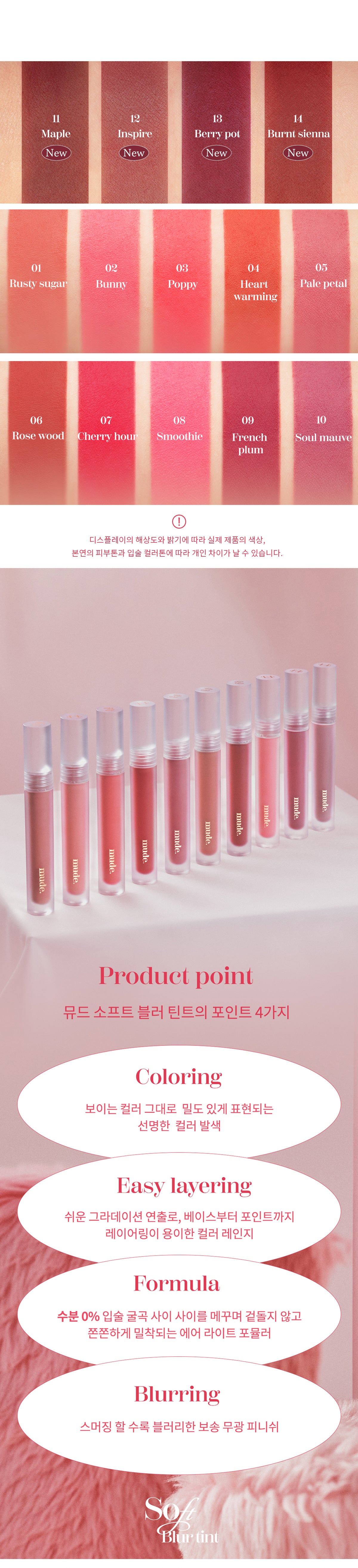 I was pleasantly surprised by the mude Soft Blur Tint. The air-light formula feels almost invisible on my lips while providing a vivid color that doesn’t fade throughout the day. I particularly enjoyed how easy it is to layer; I can create a softer gradient or go bold with multiple applications without any heaviness. Plus, the blurring effect makes my lips look fuller and smoother—exactly what I wanted! This product has become an essential in my makeup routine.