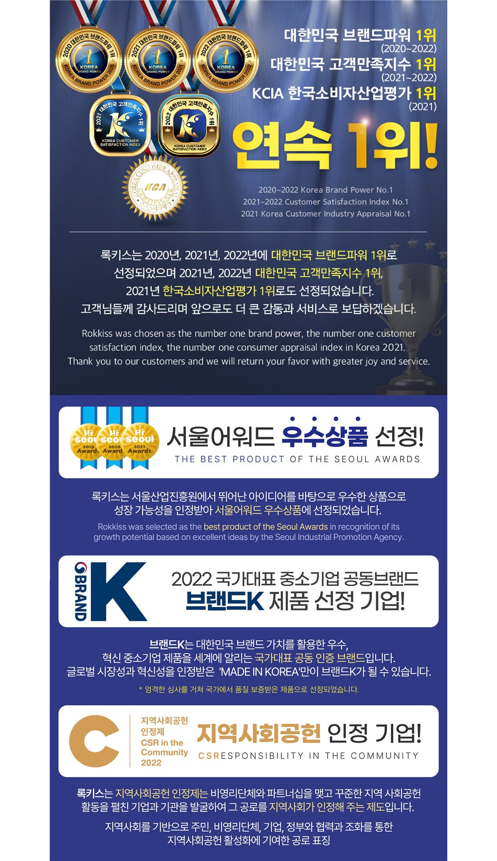 Rokkiss was selected as the No. 1 brand power in Korea for three consecutive years (2020, 2021, and 2022). Rockies also achieved 1st place in the Korea Customer Satisfaction Index (2021-2022) and the Korea Consumer Industry Evaluation in 2021.