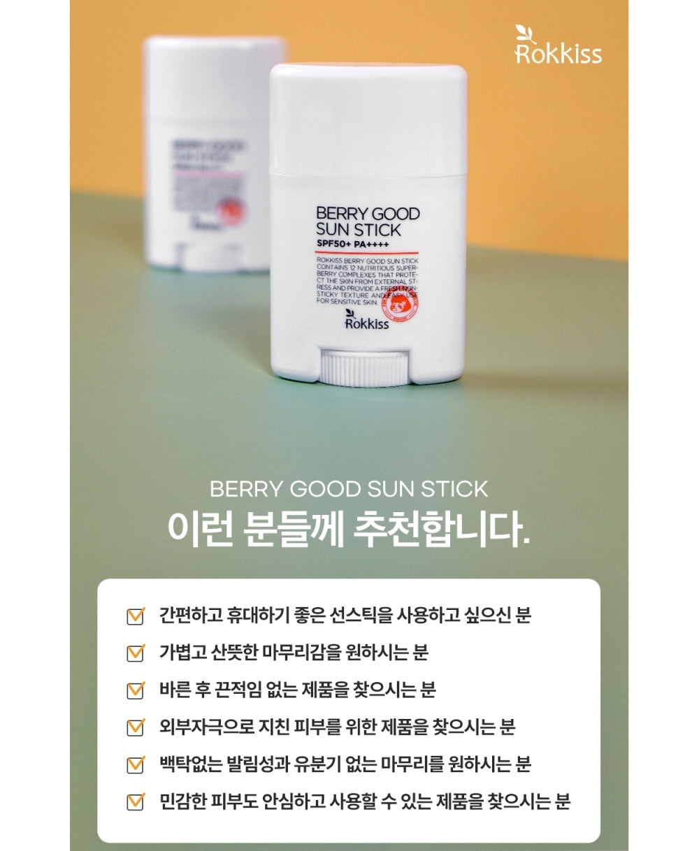 Even for sensitive skin, our sun stick provides safe UV protection with its mild ingredients. Rokkiss Berry Good Sun Stick is user-friendly and does not stick to your hands, making it a non-sticky, convenient sun product for the whole family.