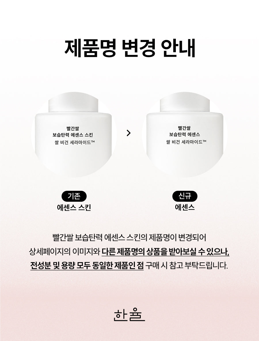 The product name of HANYUL Red Rice Moisture Firming Essence Skin has changed, so you may receive a product with a different product name than the image on the detail page. However, please note that all ingredients and dosage are the same when purchasing.