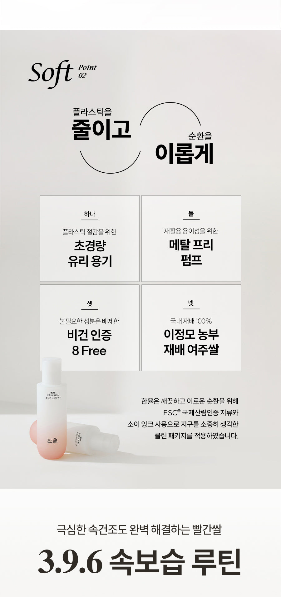 Made with ultra-light glass container, metal-free pump, vegan-certified 8-free formula and rice cultivated in Yeoju.