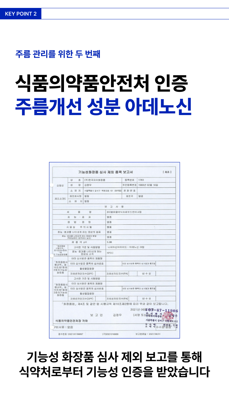 Our product also features Adenosine, a powerful wrinkle improvement ingredient that has received functional certification from the Ministry of Food and Drug Safety. It is backed by an EWG GREEN rating, ensuring its safety and effectiveness.