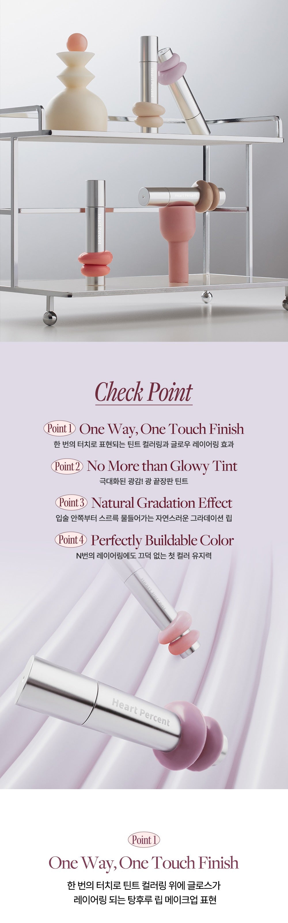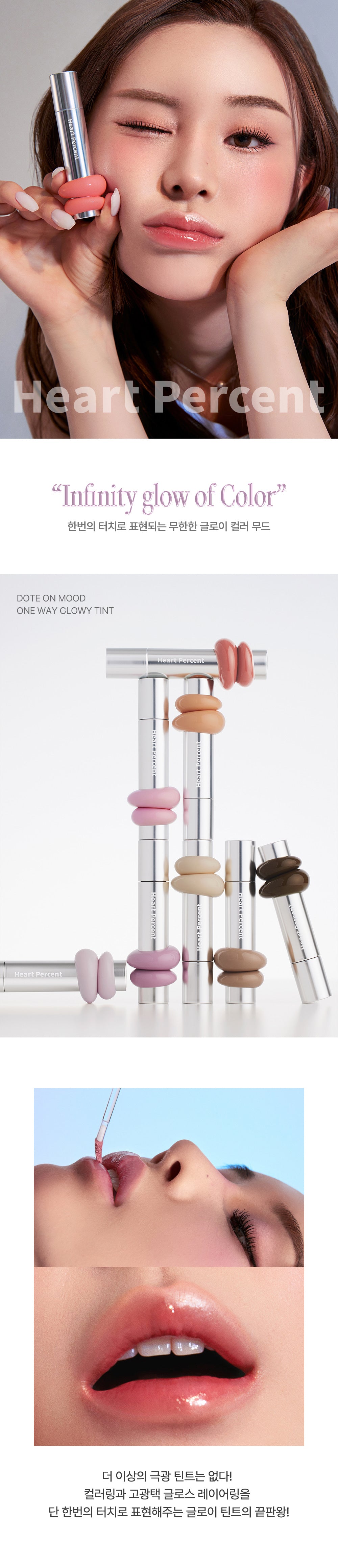 The Heart Percent Dot On Mood One Way Glowy Tint has completely transformed my lip routine. The HIPDEWY mechanism creates an incredible balance between a vibrant tint and high-impact gloss. I love that it applies effortlessly in just ten seconds, providing both color and shine with a single touch. The formula adheres to the lips beautifully, giving me confidence throughout the day without needing frequent touch-ups. Plus, the natural gradient effect looks stunning—my lips appear plump and healthy instead of flat or overly glossy.