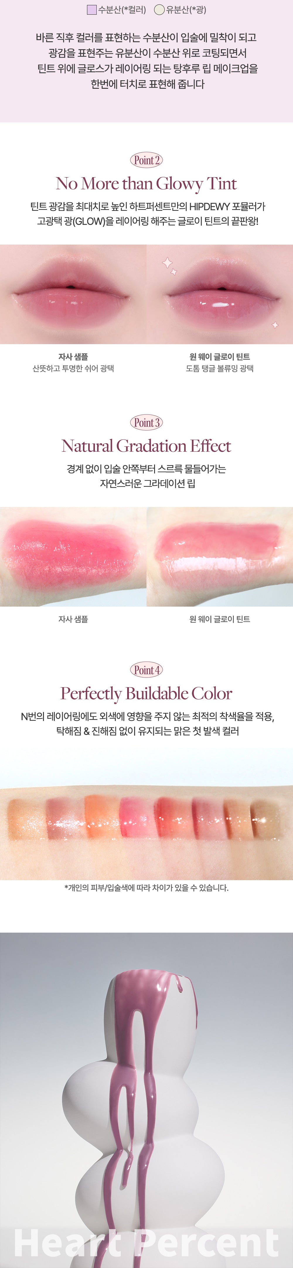 I’ve been using the Heart Percent Dot On Mood One Way Glowy Tint for a few weeks now and I’m absolutely thrilled with it. The HIPDEWY mechanism really works as described—the water dispersion provides vibrant color, while the oil layering gives my lips an impressive glossy shine that lasts for hours. It applies smoothly and I can achieve a lovely gradient effect without any effort. I’ve received so many compliments on my lip color since switching to this tint!