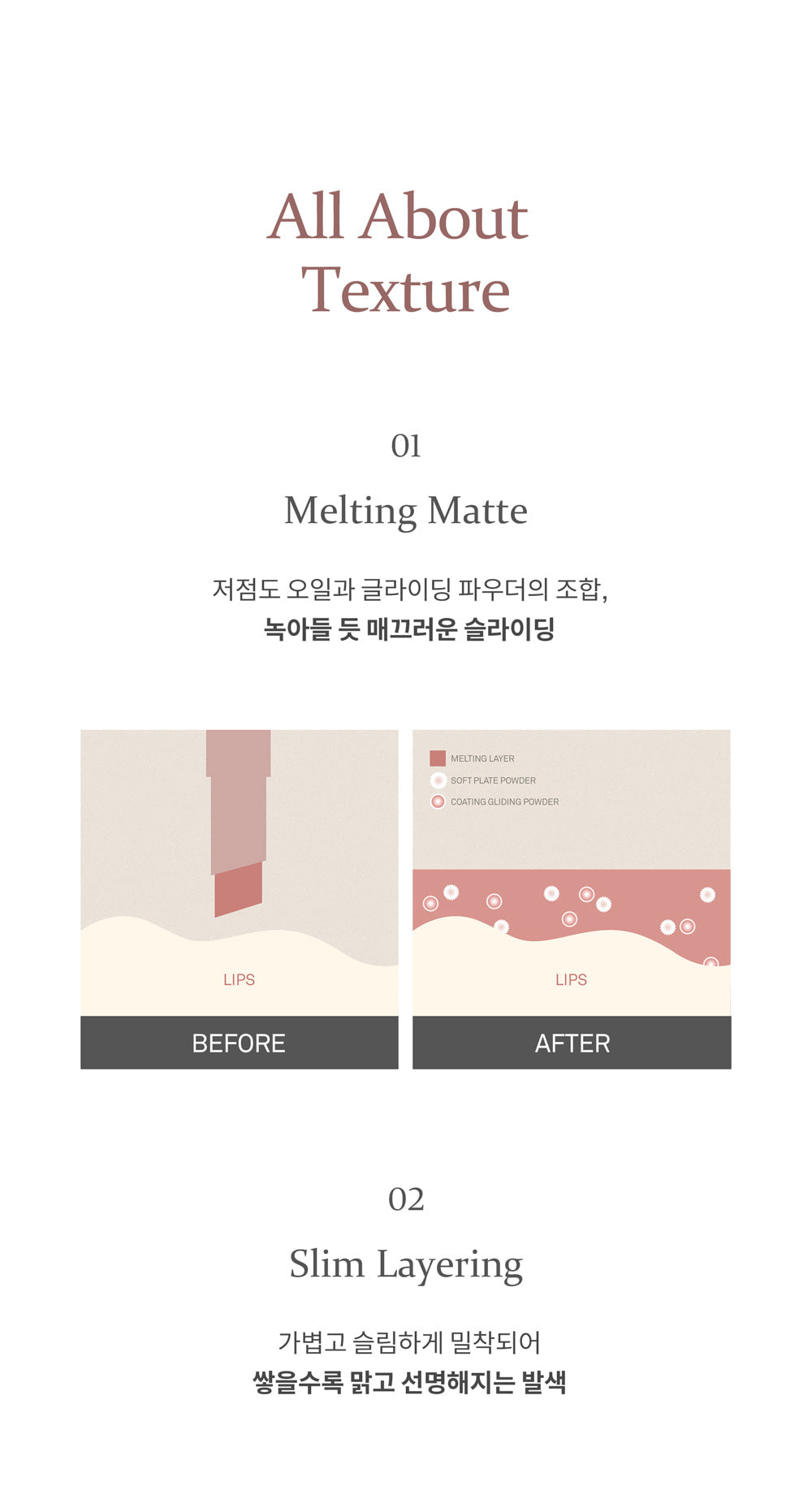 - Melting Matte: A special blend of low viscosity oil and gliding powder creates a melting sensation upon application.