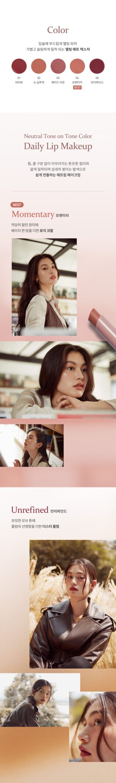 Our collection features neutral, tone-on-tone colors that are ideal for everyday wear. The lightweight pigment builds up delicately, allowing you to create versatile lip makeup looks with ease.