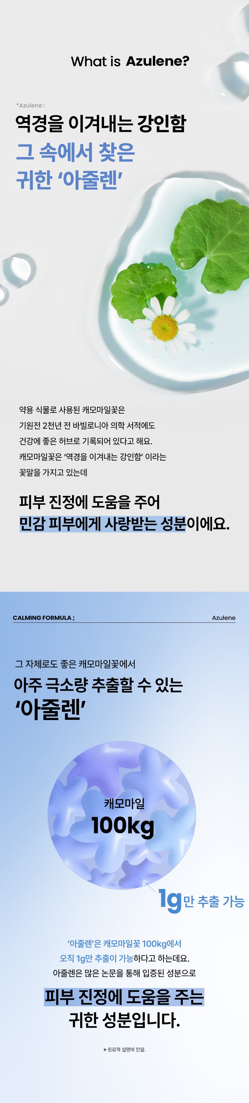 - Azulene: Extracted from chamomile, azulene is a rare and valuable ingredient for calming the skin. Only 1g can be extracted from 100kg of chamomile.