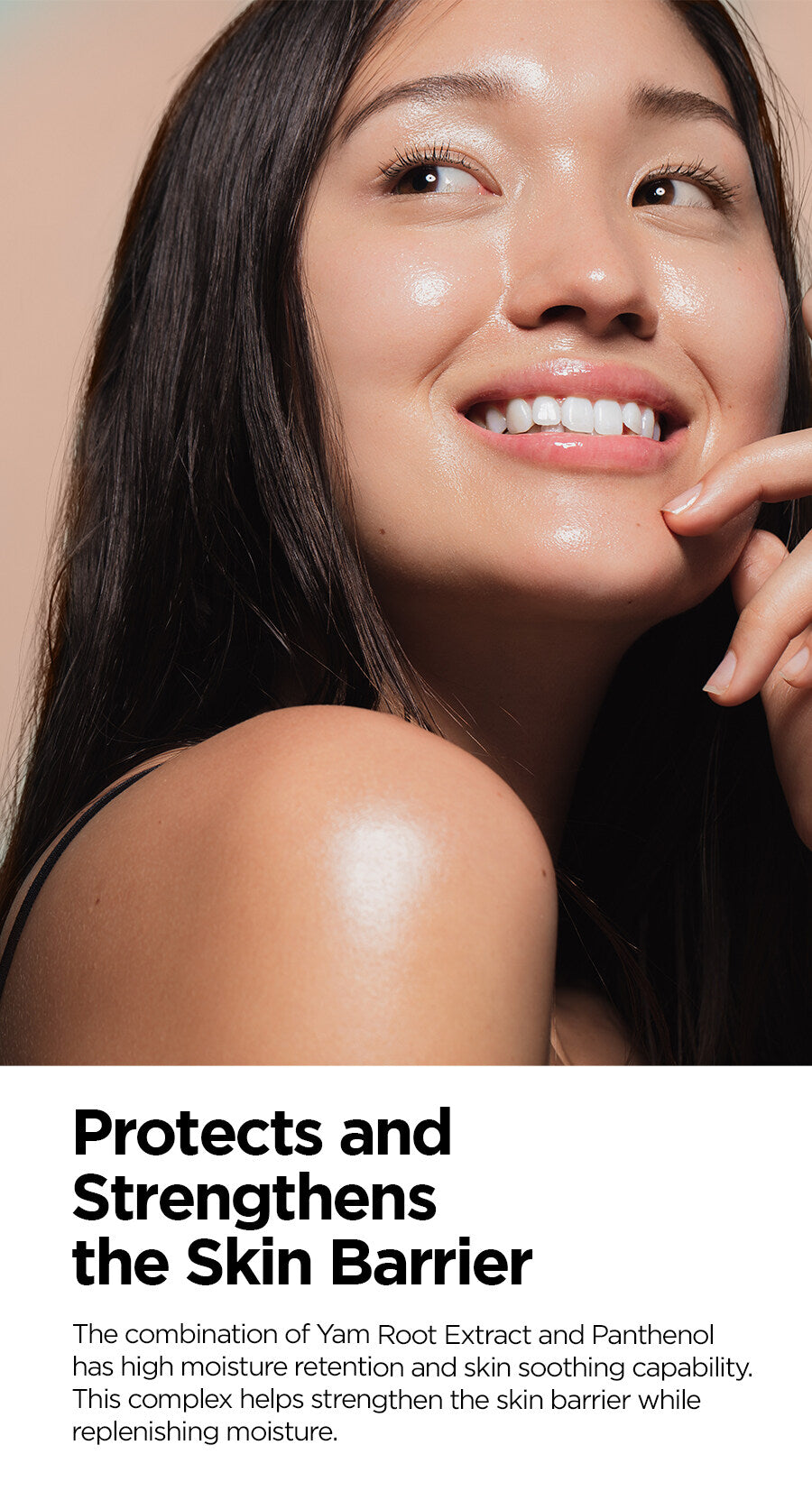 50,000 ppm of Yam Root Extract from Andong provides effective moisture retention to strengthen skin barrier and replenish moisture for soft, smooth, and moisturizing skin.