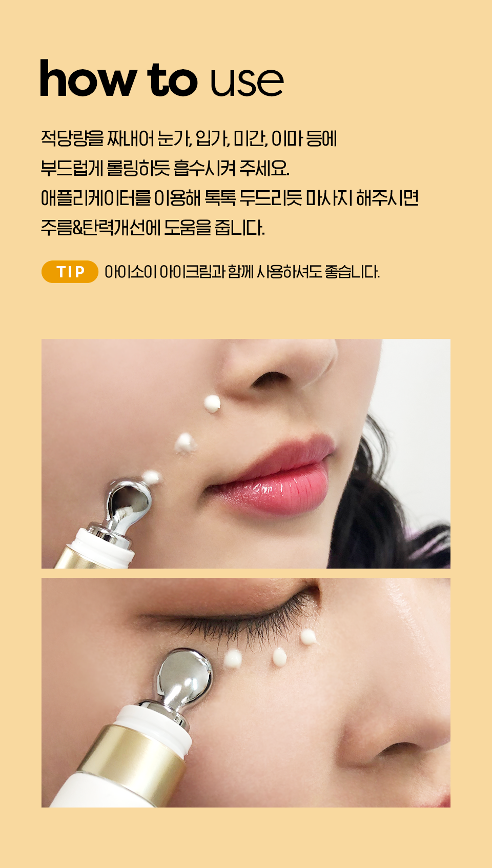 For optimal benefits, apply an appropriate amount to areas prone to wrinkles such as around the eyes, mouth, and forehead. Use the cooling applicator to gently massage and tap the product into the skin, enhancing absorption and improving skin elasticity and wrinkle appearance.