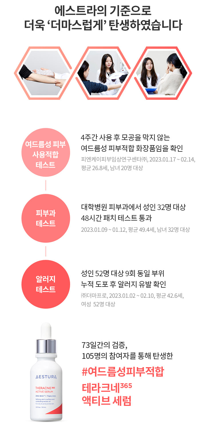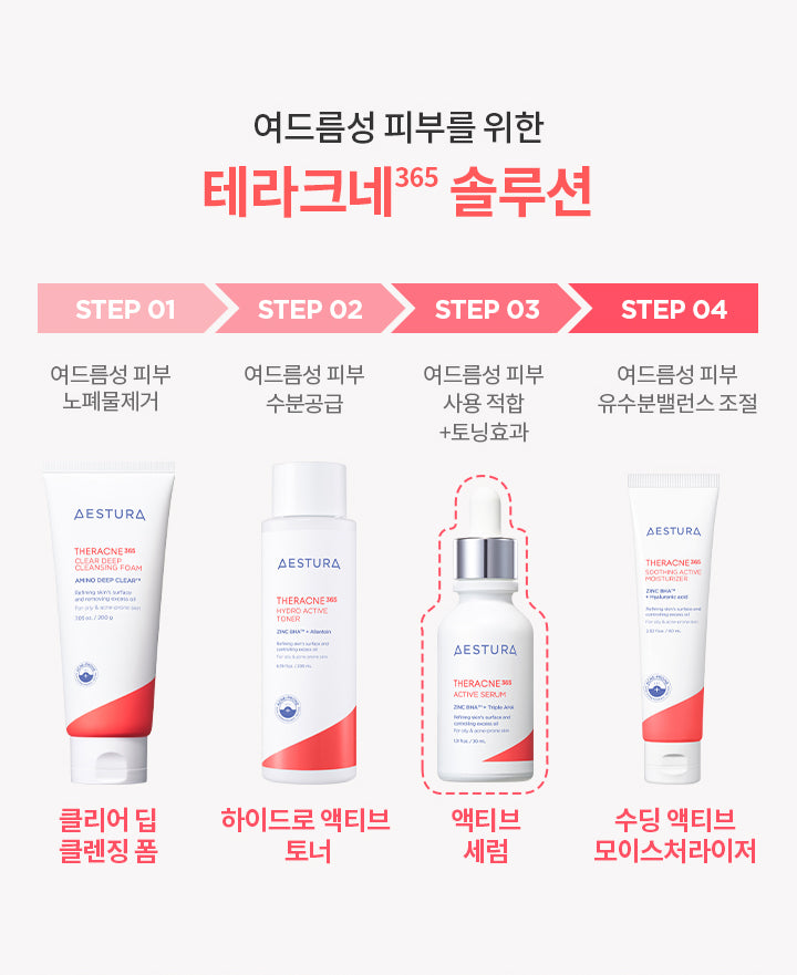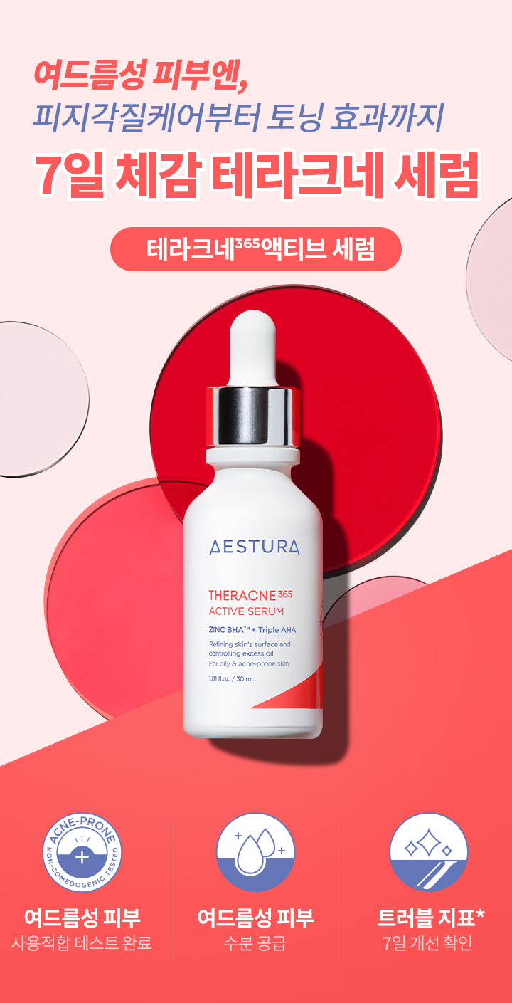 Acne-prone skin often falls into a repetitive cycle of sebum production, dead skin cell accumulation, and pore blockage, leading to persistent issues. The Aestura Theracne365 Active Serum, formulated based on 30 years of specialized research in acne-prone skin, addresses these core issues with its key ingredients.