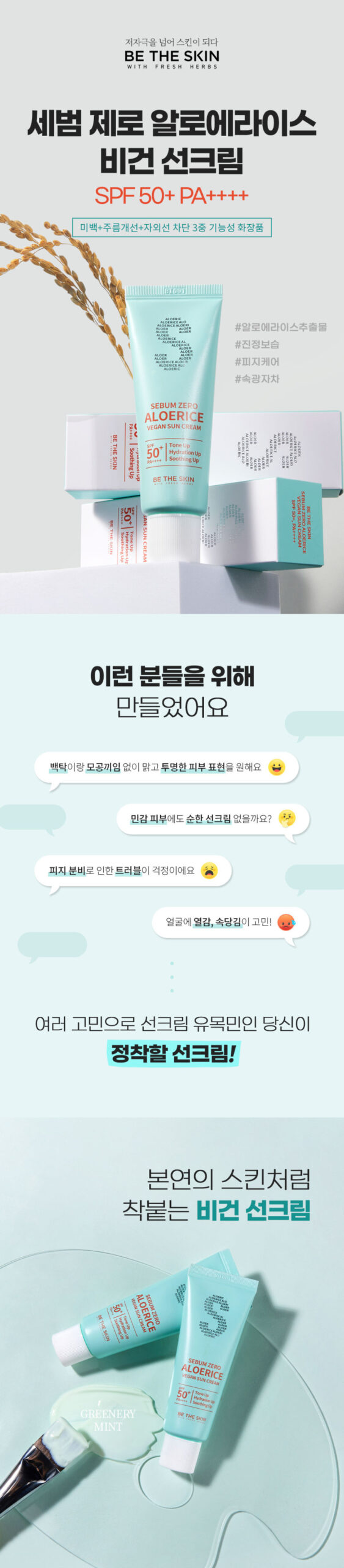 BE THE SKIN Sebum Zero Aloerice Vegan Sun Cream SPF 50+ PA++++ 50ml