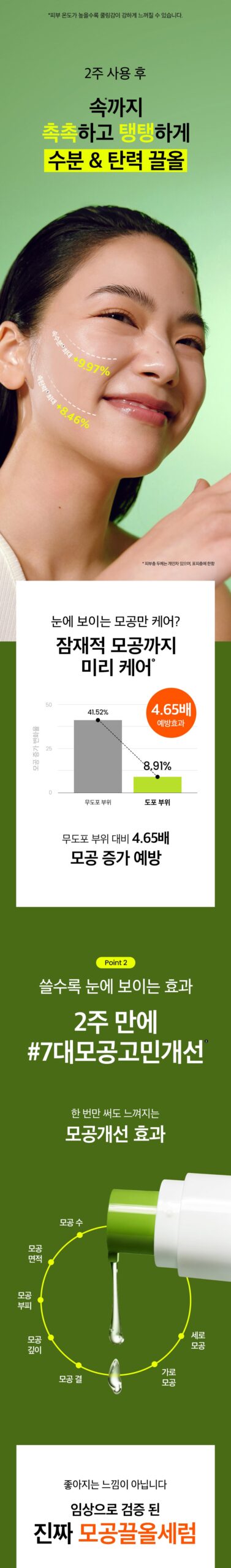 - Long-Lasting Hydration and Firmness: Even after 2 weeks, your skin will feel moisturized and firmer to the touch. It effectively prevents the re-enlargement of pores and offers a lifting effect that rejuvenates the skin’s appearance.