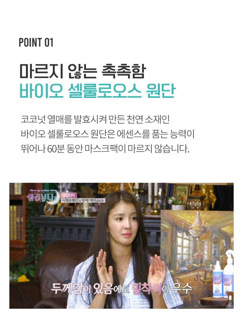 Unlike traditional non-woven mask sheets that dry quickly and limit the absorption of active ingredients, the bio-cellulose material remains moist and adheres perfectly to your skin, even during movement.