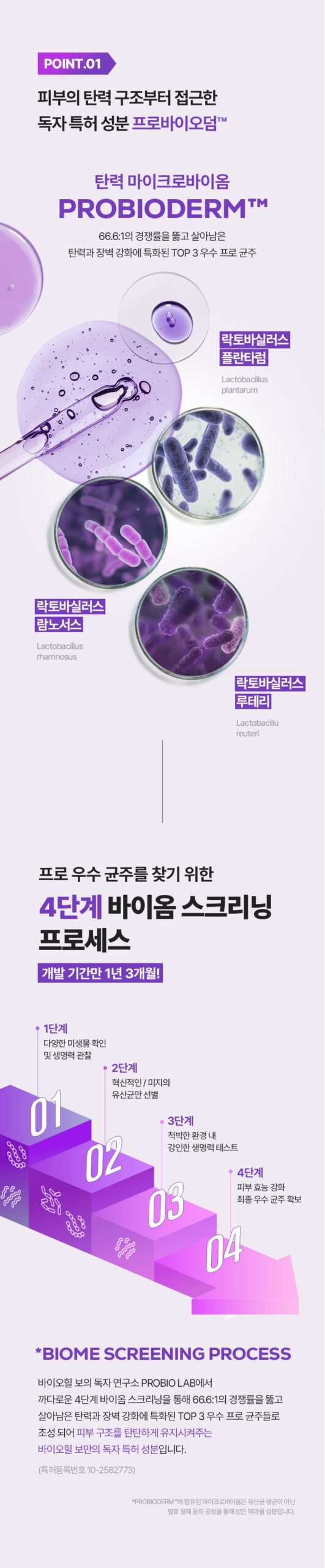 At the heart of this formula lies the unique patented Probioderm™ complex, featuring a trio of potent probiotic strains: Lactobacillus plantarum, Lactobacillus rhamnosus, and Lactobacillus reuteri. Developed through PROBIO LAB’s meticulous 4-stage screening process, this elasticity-boosting complex is optimized for enhancing skin elasticity and fortifying the skin barrier.