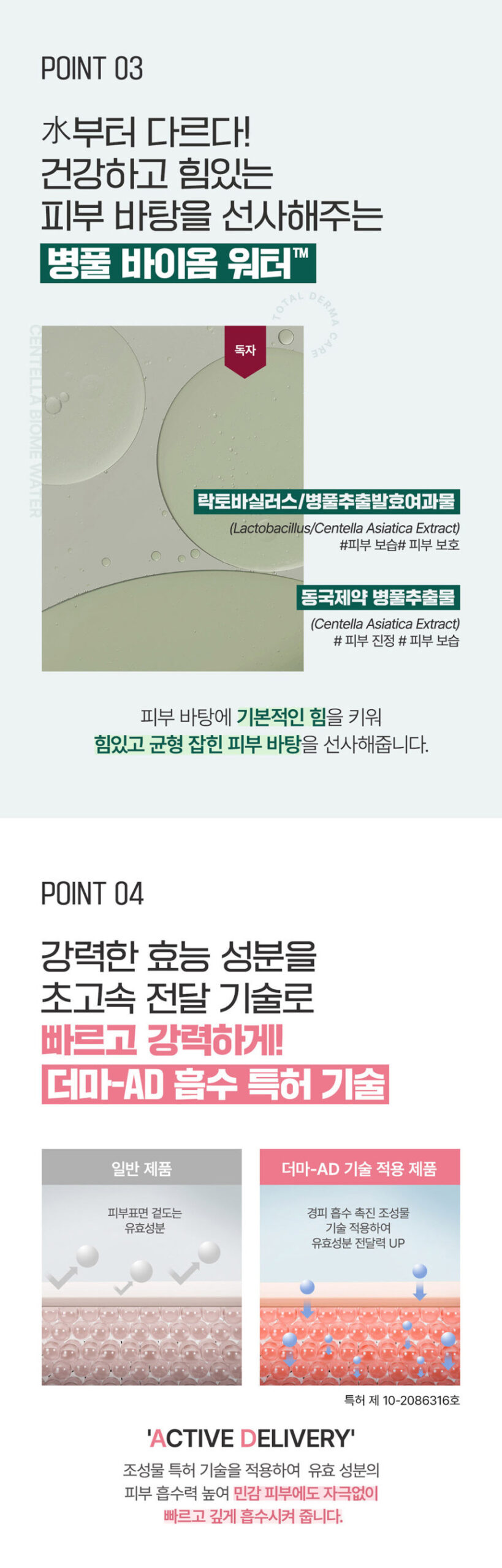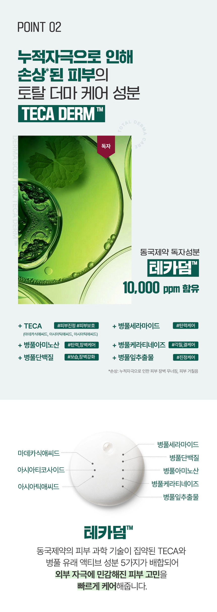 - Tecaderm™: Contains 10,000ppm of Tecaderm™, rich in Centella Asiatica derivatives, addressing multiple skin concerns from soothing and protection to moisturization and elasticity enhancement.