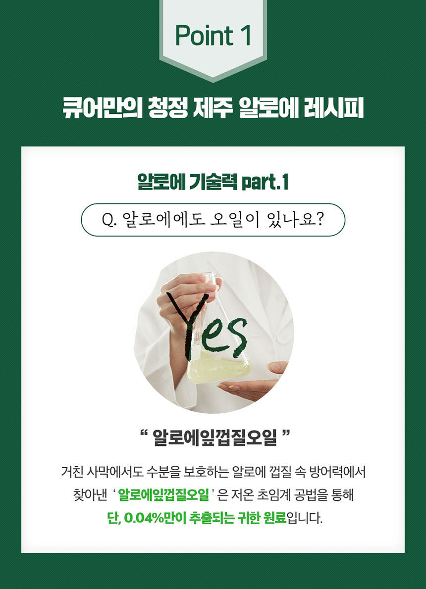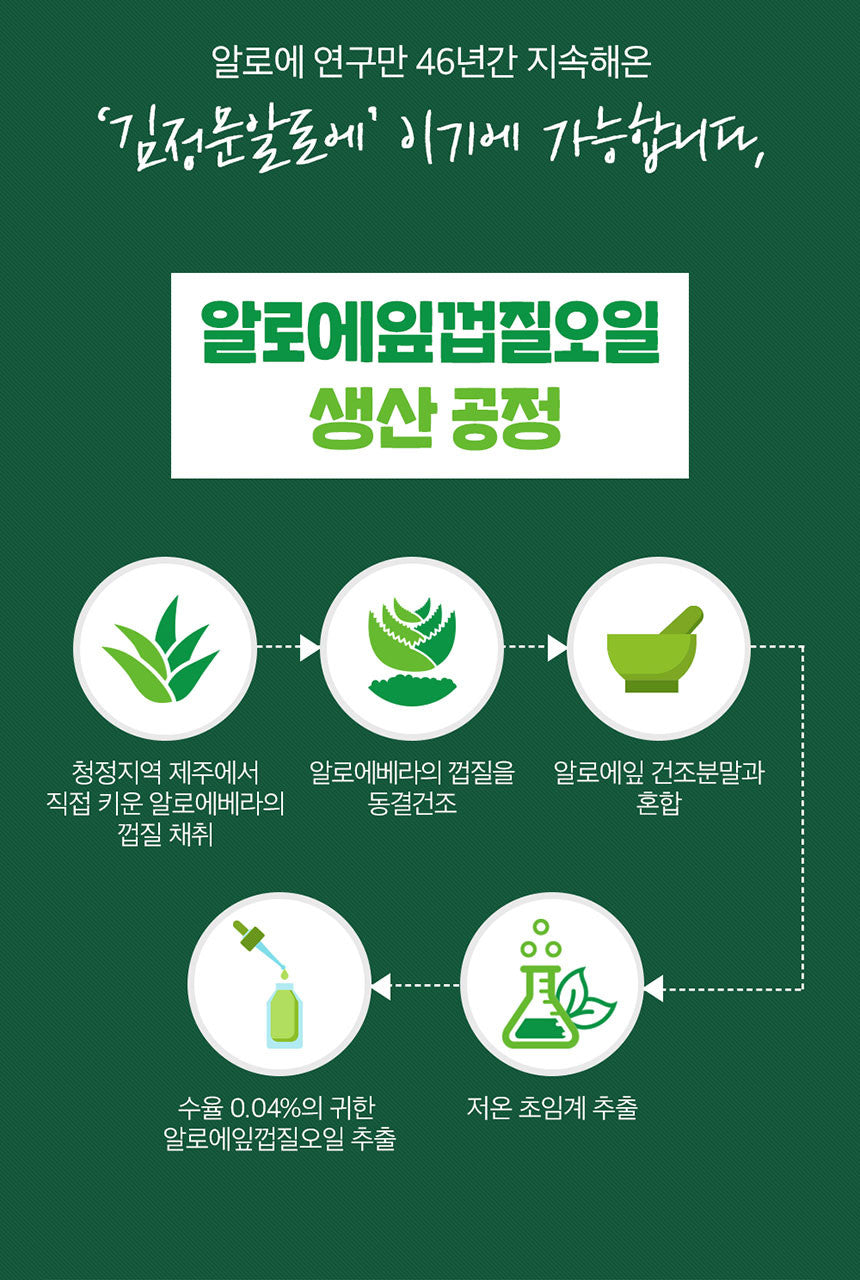 Only 0.04g of rare aloe oil is extracted from 1kg of aloe leaves. This precious oil, found in the resilient aloe skin that retains moisture even in harsh deserts, is the key to our product’s effectiveness.