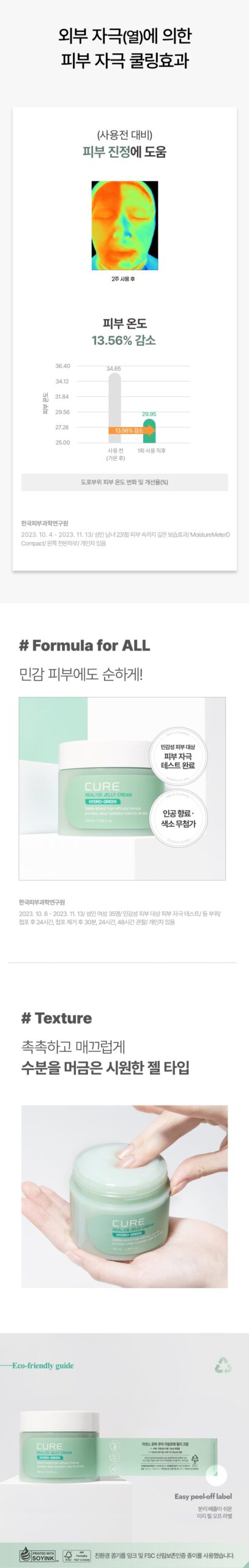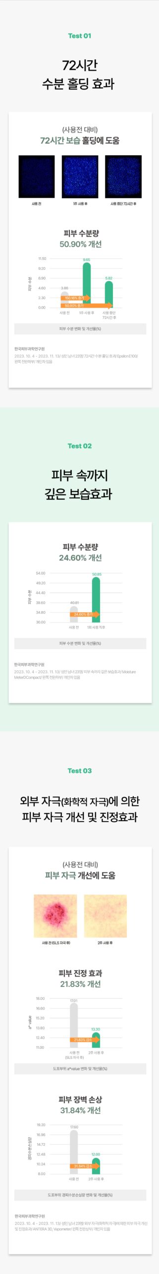 - 72% Jeju Aloe Vera Leaf Juice: Directly harvested from Jeju Island, the aloe vera leaf juice forms the core of this cream, ensuring your skin enjoys up to 72 hours of moisture retention. Clinical tests have shown a 50.90% improvement in skin moisture, a 21.83% enhancement in soothing effects, and a significant repair in skin barrier damage by 31.84%. It also cools the skin temperature by 13.56%, bringing immediate relief.