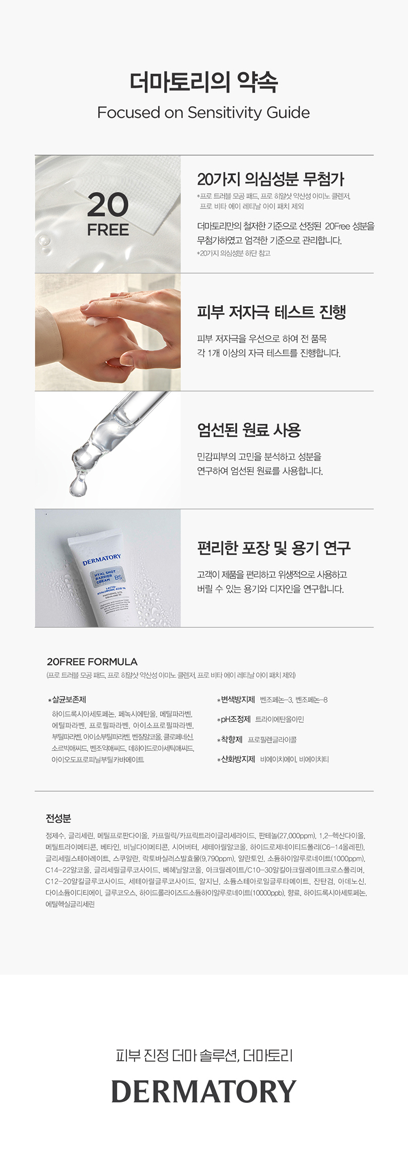 Our formulation is free from 20 kinds of medicinal ingredients and has undergone a skin hypoallergenic test. We prioritize the use of carefully selected raw materials and have invested in research to ensure the packaging and container are both convenient and sustainable.
