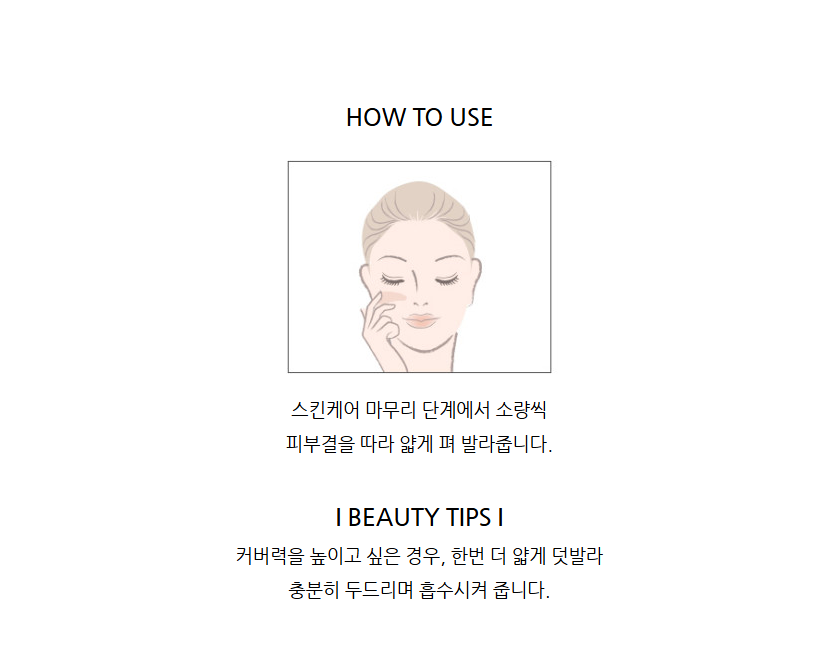 At the final step of your skincare routine, apply a small amount thinly along the skin texture. For increased coverage, apply an additional thin layer and pat until absorbed.