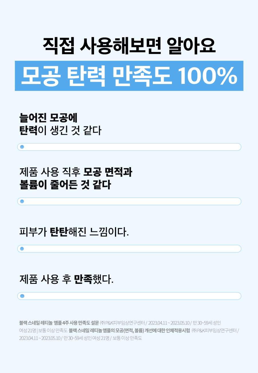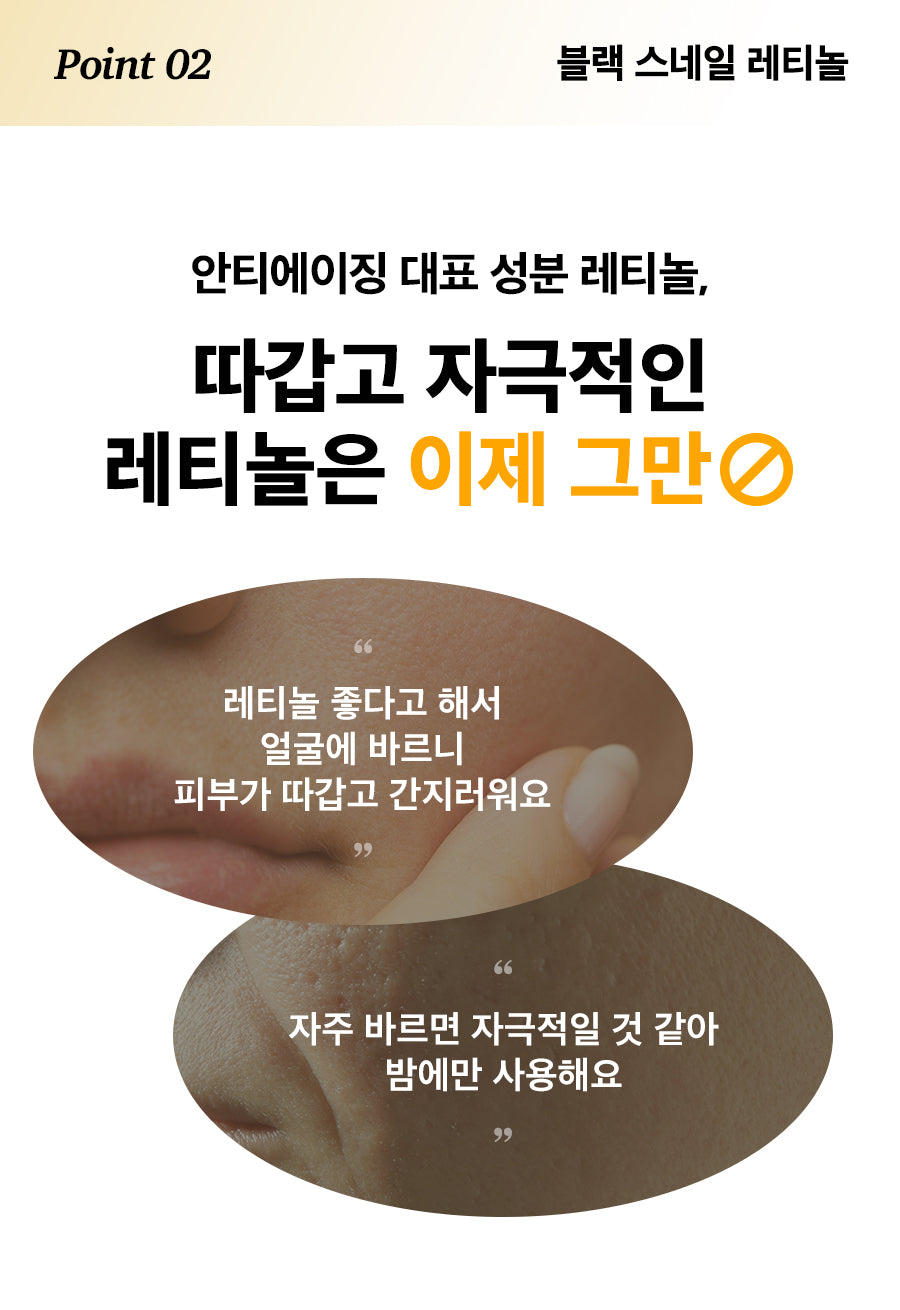 Achieve unmatched pore elasticity from the very first application with our Black Snail Retinol Ampoule. Experience a triple-action improvement on your skin’s pore area, volume, and depth, thanks to our exclusive ACTIVE MUCIN formulation. This potent ingredient, superior to regular mucin, employs a double liposome method for stable delivery of actives and peptide mucin to maximize efficacy. Embrace the sensation of ingredients being deeply absorbed into your skin, leaving you with 100% satisfaction in pore elasticity.