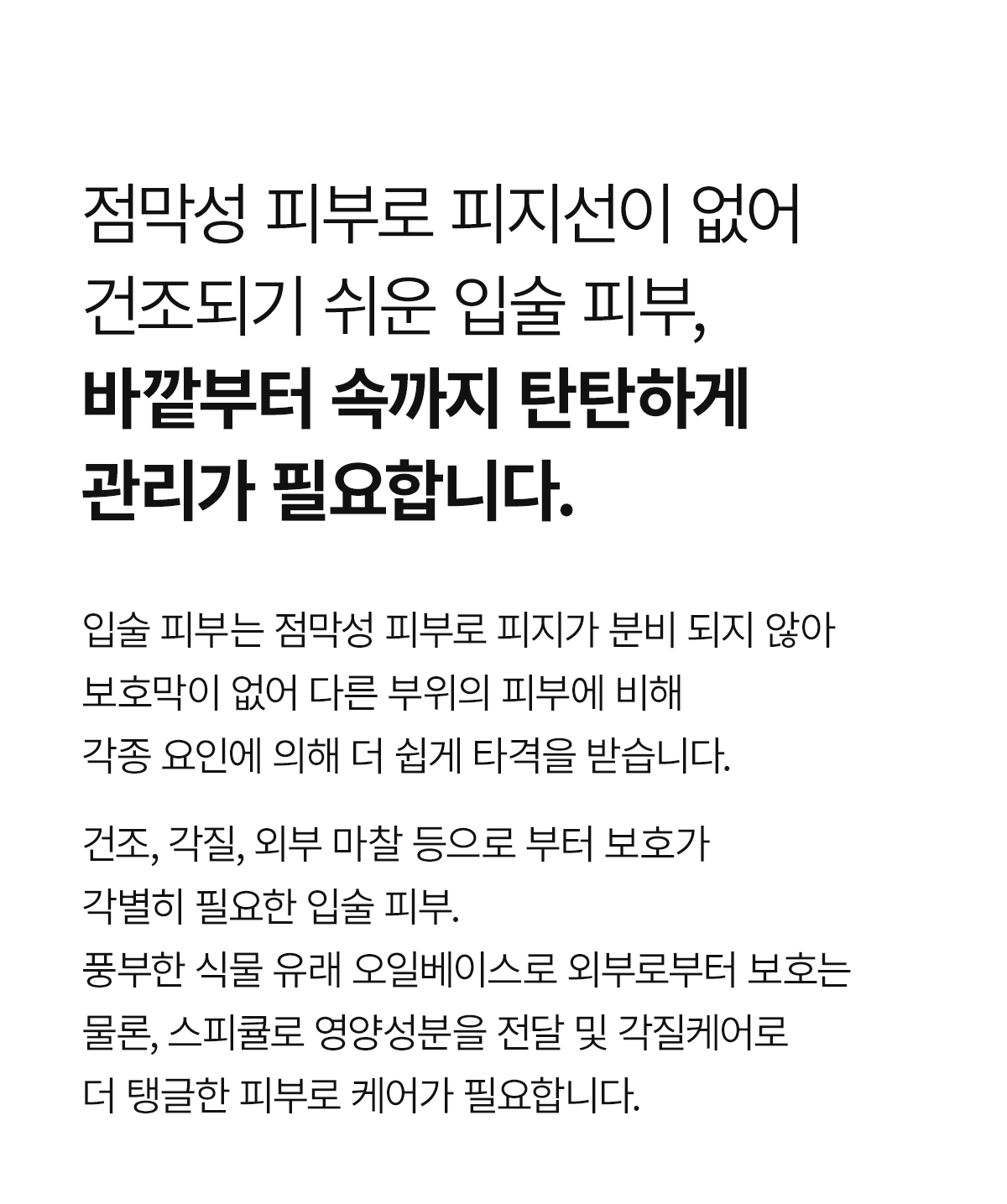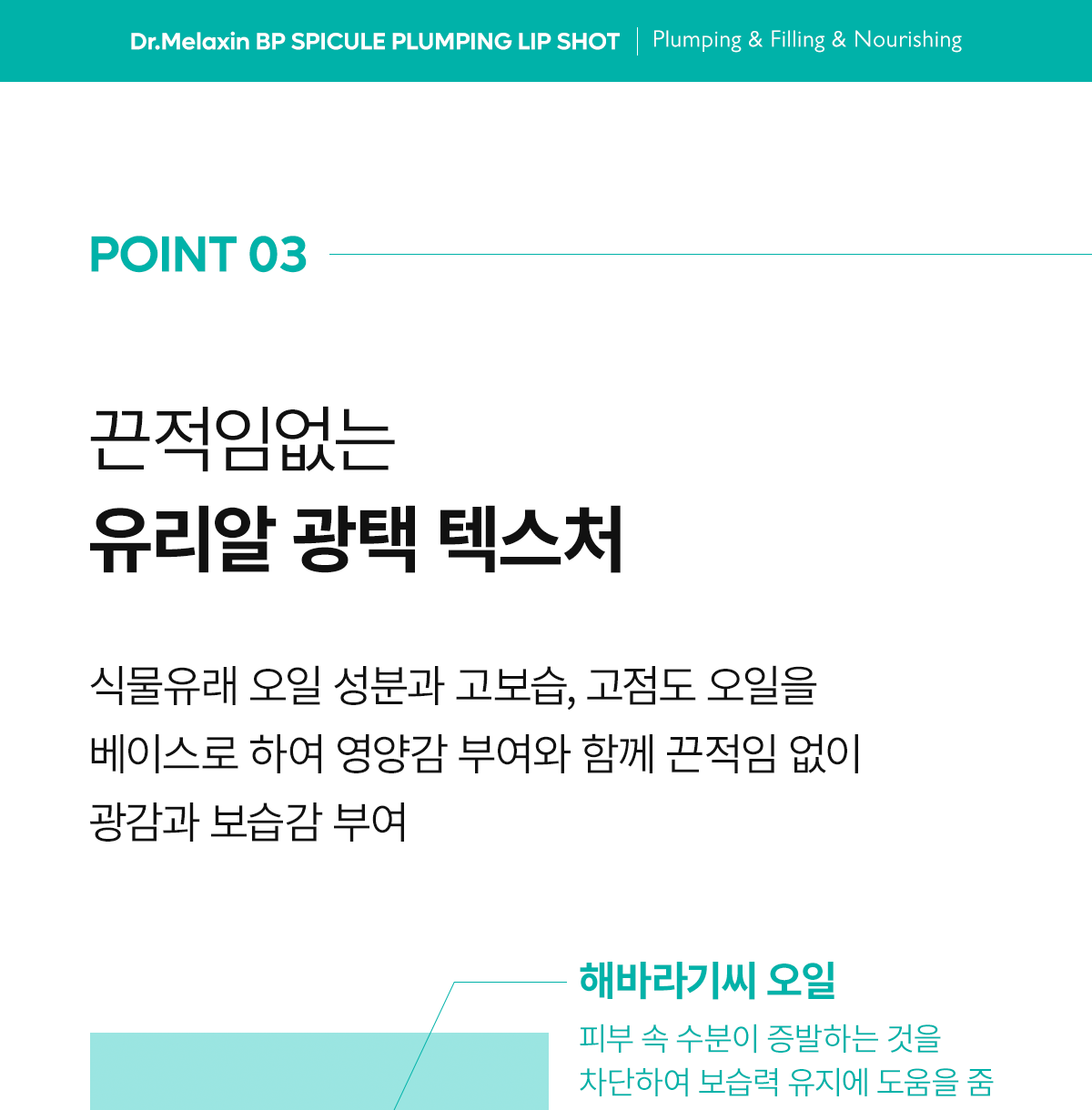 The delicate mucosal nature of lip skin makes it prone to dryness and damage as it lacks natural oil production. Daily exposure to dryness, friction, and environmental stressors can weaken the lips. BP Spicule Plumping Lip Shot combines spicule technology with a plant-derived oil base to nourish, protect, and enhance lip texture.