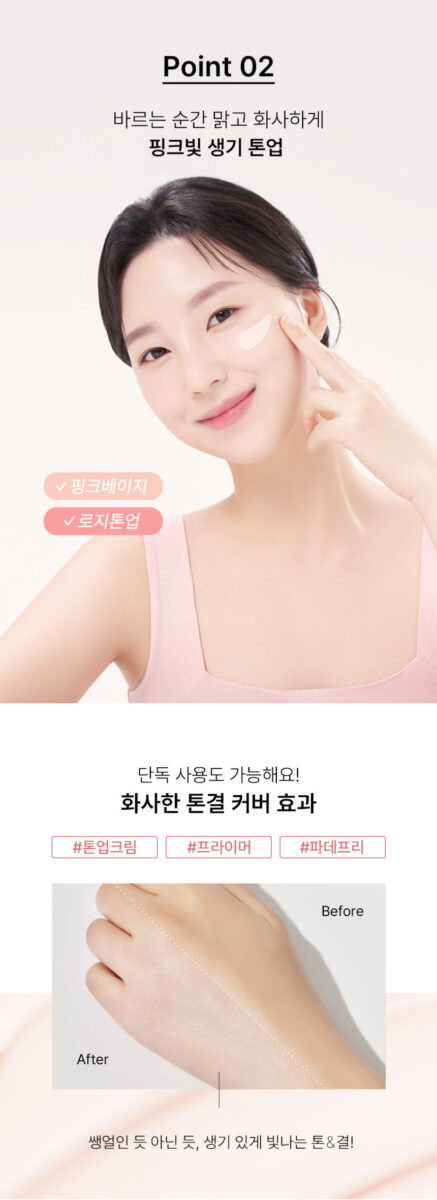 Rosy Tone-Up Effect: Instantly brightens dull complexion with a natural pink tint — great as a standalone or base makeup.