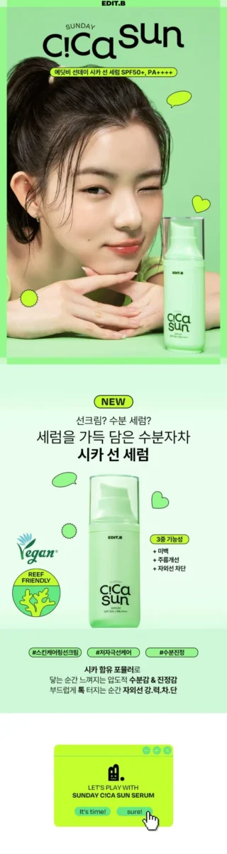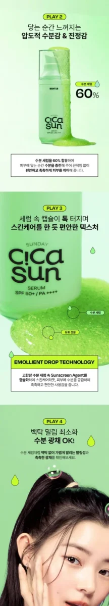 Hey! Just tried out this EDIT.B Cica Sun Serum, and let me tell you—game changer! I live in LA, so sun’s no joke here. This serum doesn’t just sit there like those heavy creams; it sinks right in and feels super light. It’s amazing because there’s zero white cast, which is a rare find! My face felt really hydrated without feeling sticky afterward—win-win!