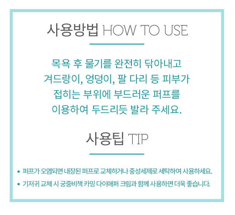 After bathing, wipe off the water completely and apply to areas where the skin is folded, such as the armpits, buttocks, arms and legs, using a soft puff to pat it.