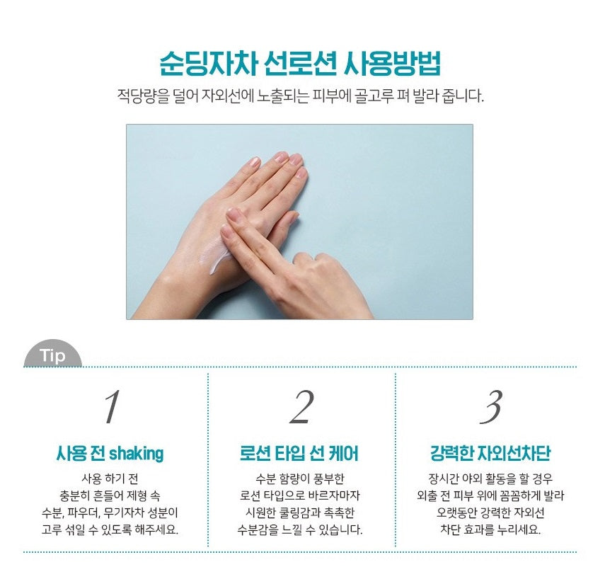 Rather than applying a large amount at once, it is important to apply a small amount to the skin in a small amount approximately 15-30 minutes before going out, and reapplying it as often as possible is more effective. It is easily removed by sweat, skin, and external stimuli, so you can effectively protect your skin from UV rays by reapplying it in 2-3 hours.