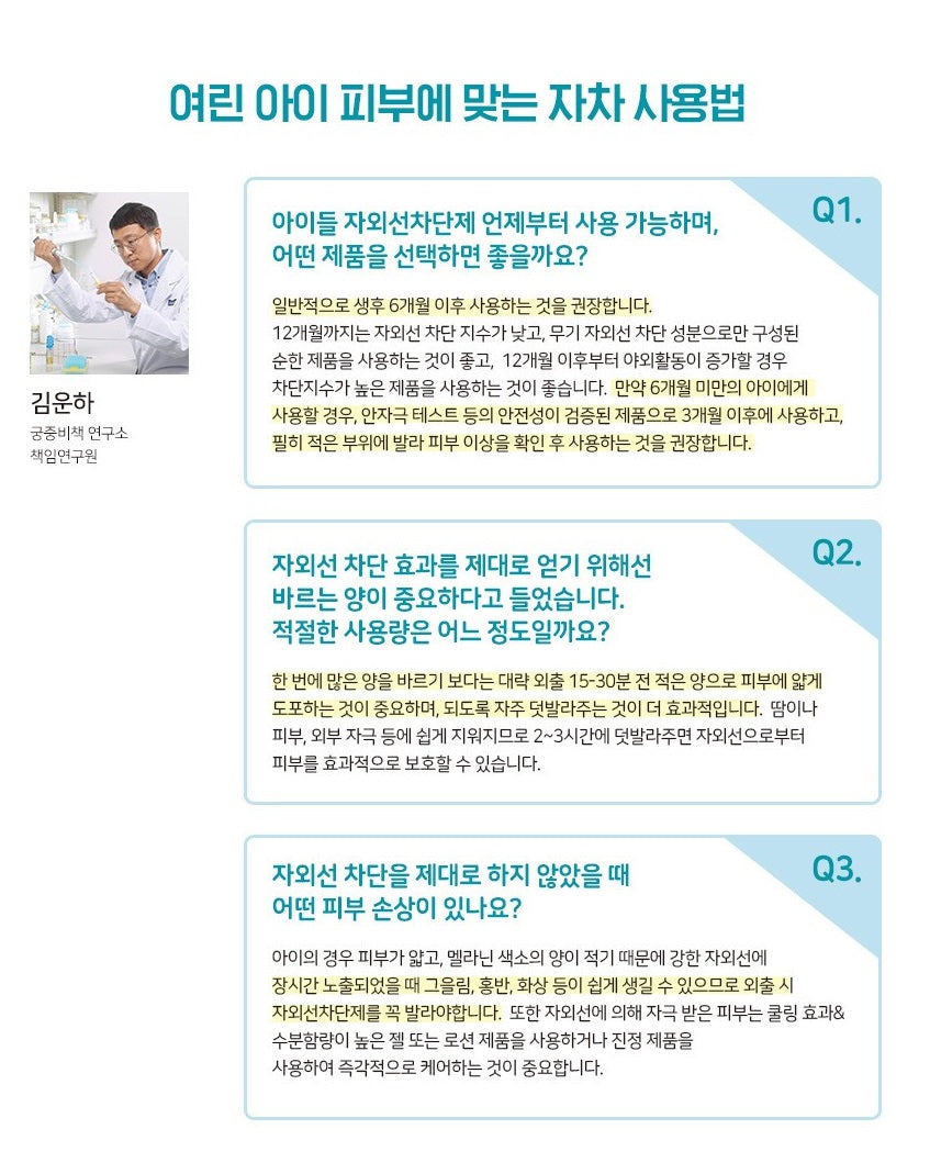 In general, it is recommended to use it after 6 months of age. Until 12 months, it is recommended to use mild products with a low UV protection factor and only inorganic UV blocking ingredients, and if outdoor activities increase after 12 months, it is recommended to use a product with a high blocking factor. If used on children under 6 months of age, it is recommended to use it after 3 months as a product with proven safety, such as eye irritation test, and apply it on a small area to check for skin abnormalities.