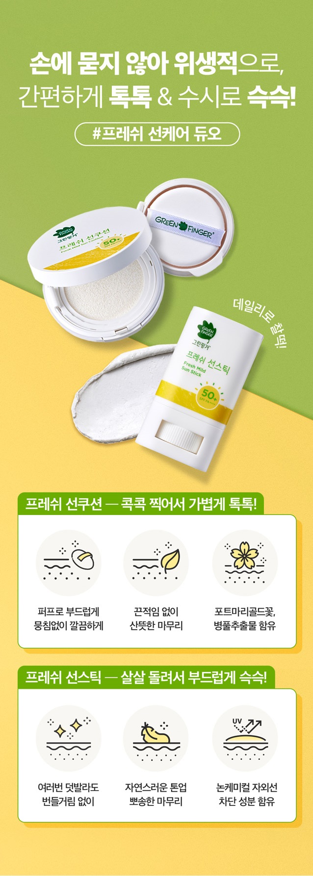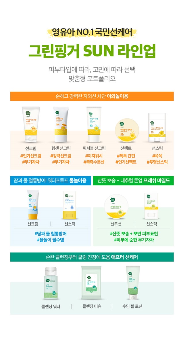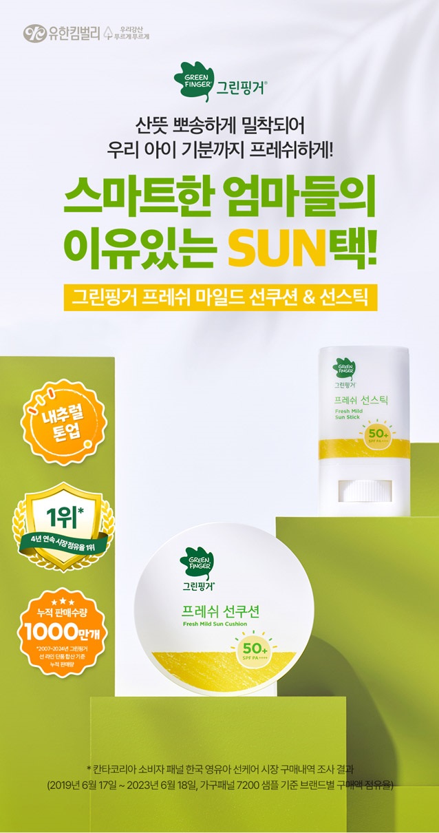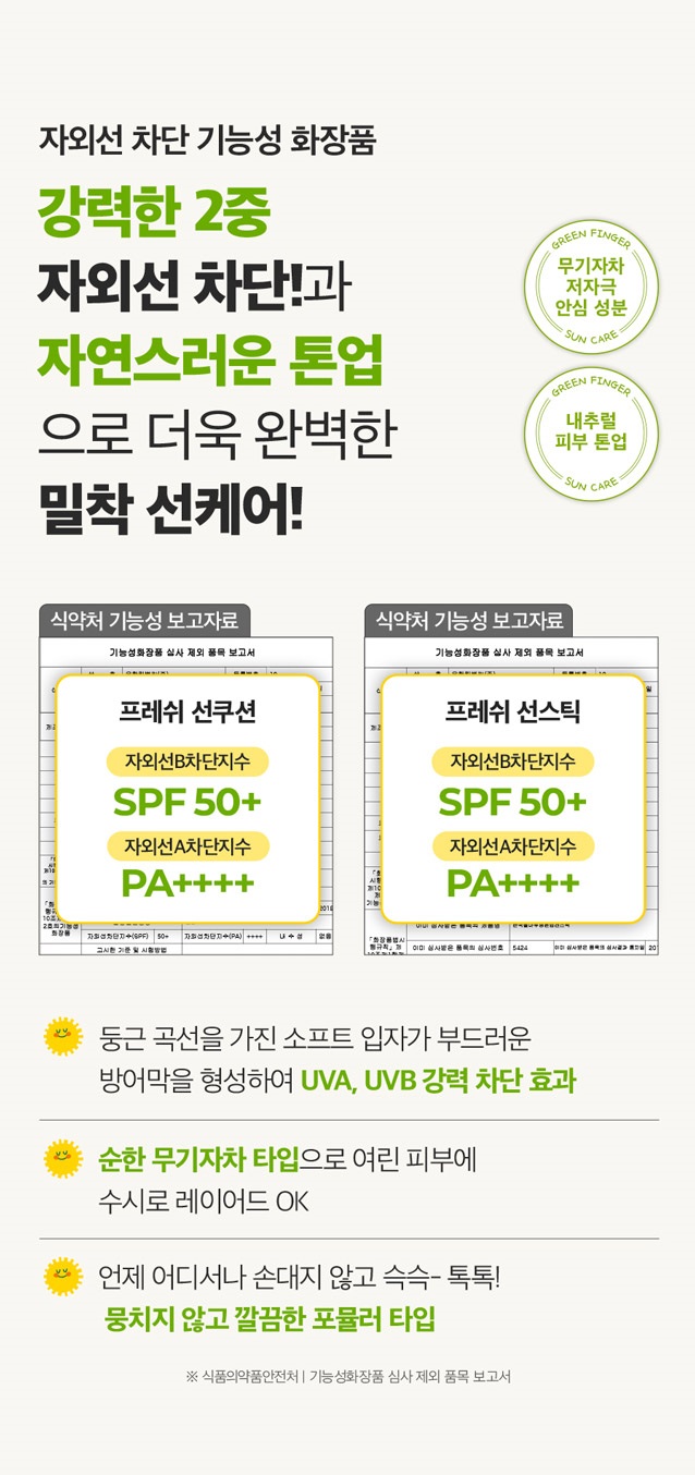 The GREEN FINGER Fresh Mild Sun Cushion & Sunstick is Korea’s leading sun care duo. Apply it lightly, and reapply as frequently as needed, ensuring the best sun protection for your child’s skin. Invest in your child’s skin health with our sun care products. It’s not just skincare; it’s love in every touch.
