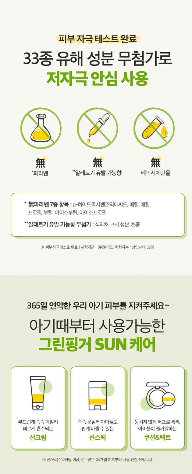 Our sun cushion has been extensively tested for skin irritation and is free from 33 types of harmful ingredients, offering a safe and gentle solution for your child’s skin.