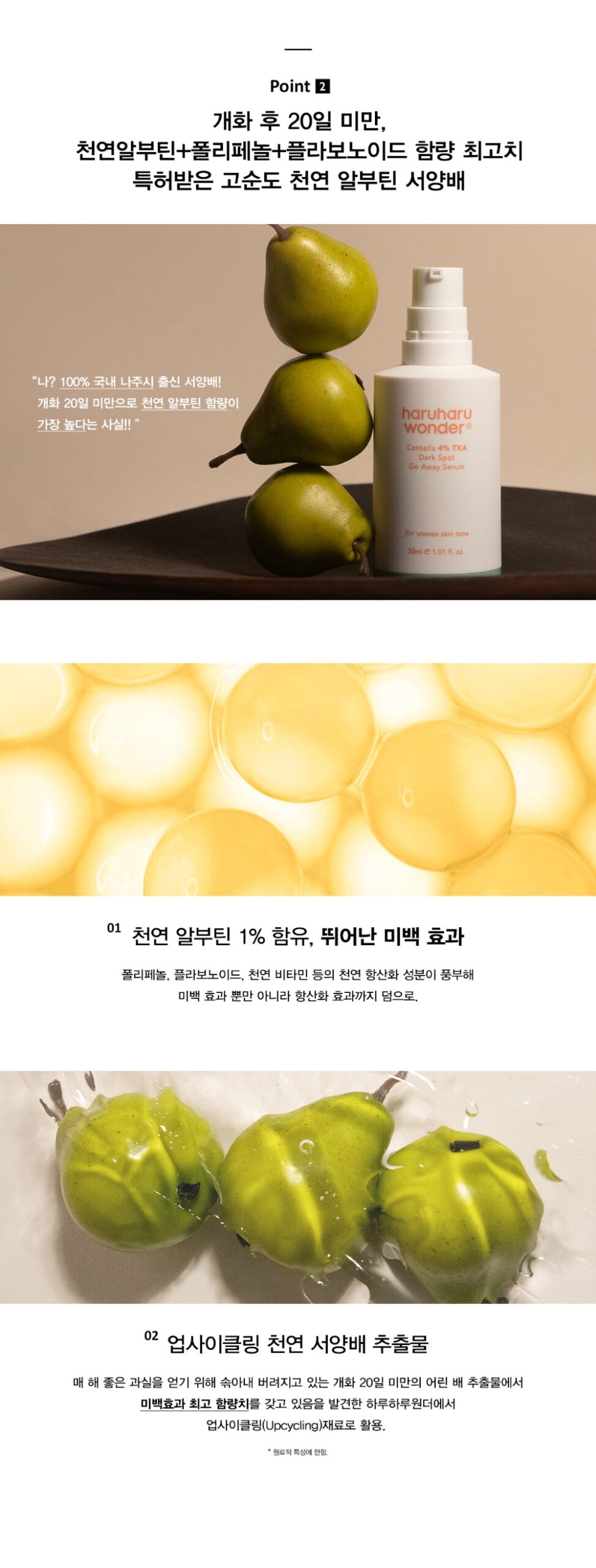 - Innovative Extracts: Utilizes Pyrus Communis (Pear) Fruit Extract sourced from unripe fruits that are typically discarded annually, discovered by Haruharu Wonder to have potent whitening effects.