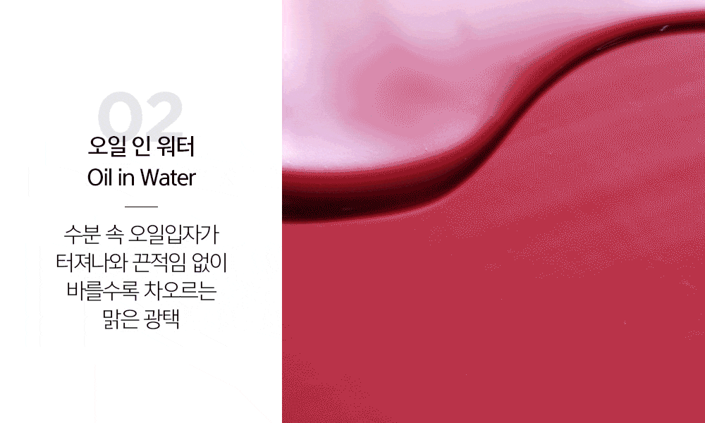 The LIP-PRESSION Glow Lasting Tint stands out with its ‘Oil in Water’ composition. This formulation causes oil particles to burst from the water base, delivering: