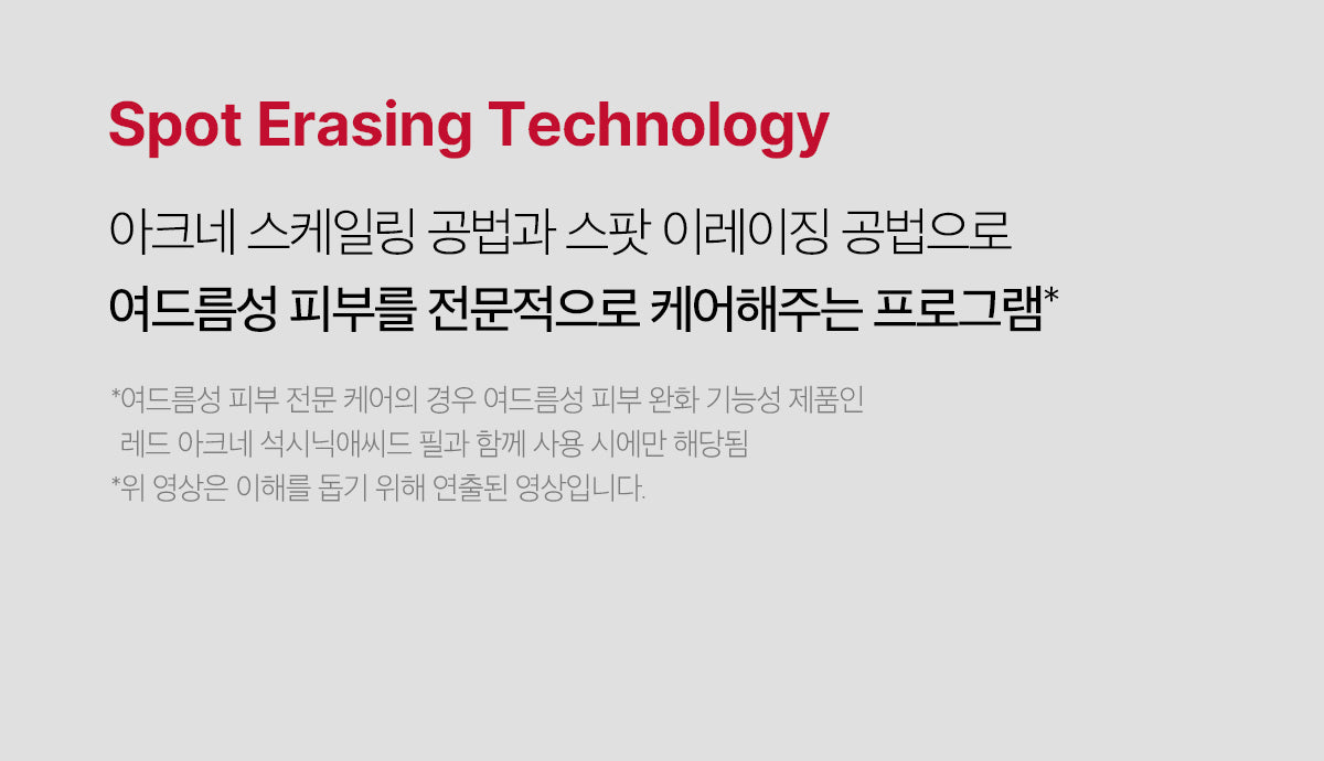 A program that cares for acne-prone skin using the acne scaling method and spot erasing method.