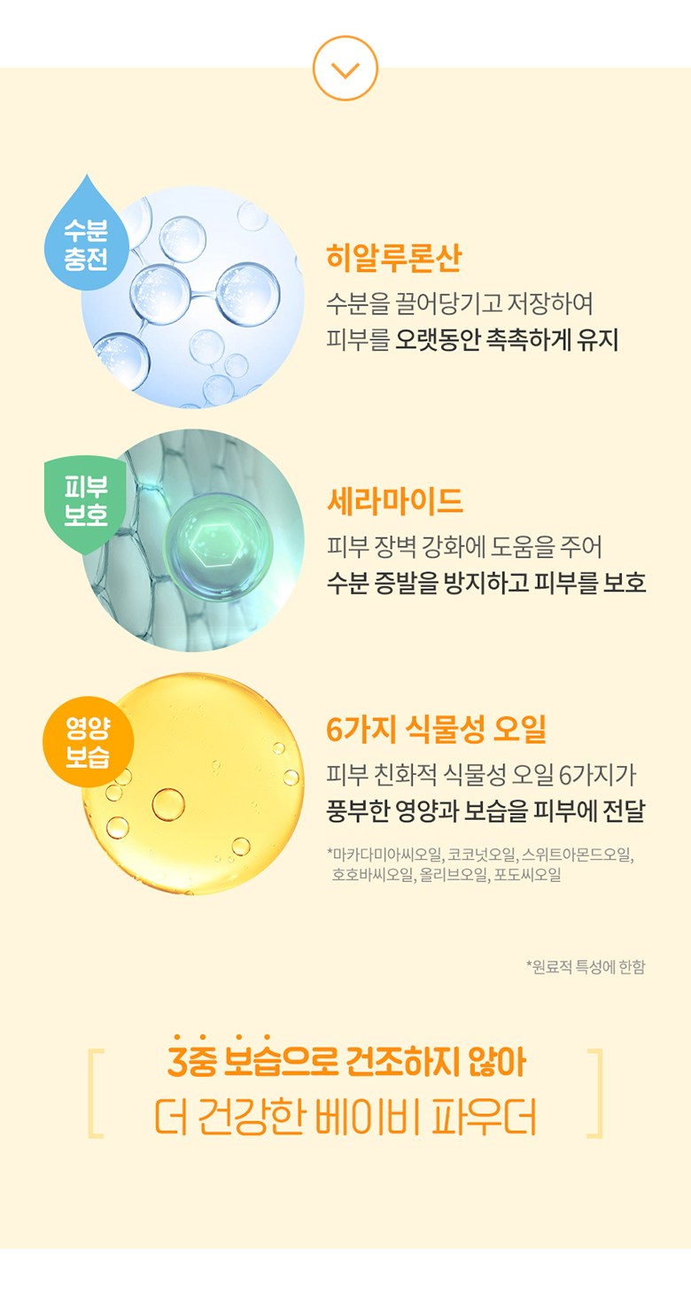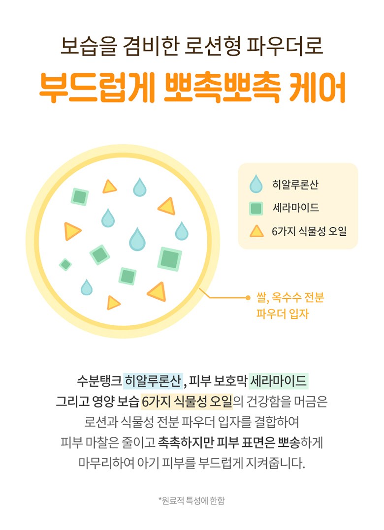 The heart of our formula lies in its vegetable starch powder, which combines rice and corn starch for a gentle moisture removal process, leaving your child’s skin soft and dry. Enhanced with hyaluronic acid for moisture replenishment, ceramide to strengthen the skin barrier and prevent moisture evaporation, and a blend of six types of vegetable oils for nutritious moisturization, it offers triple moisturizing benefits for a healthier alternative to traditional baby powder.
