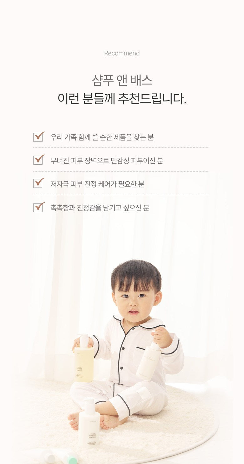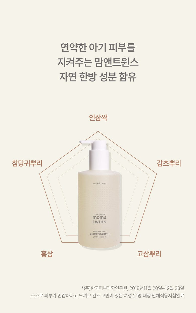 私の赤ちゃんが初めて使うシャワーとバス用製品として、mom&twinsの純植物ベビーシャンプー&バスを試してみました。この商品の優れた点は、完全に自然な成分でできているところです。特に、このマイルドな使用感によって、お肌や髪も十分しっとりと保湿されることが感じられます。お薬草抽出物(高麗人参、小楠竹、生姜など)の混合から生まれる滑らかな仕上がりは目覚ましい!ただ使っただけなのに娘のお肌の質感が向上した気さえします。その影響力には本当に驚きました。同時に何か良いものを与えてあげたい親心にも応えるので、とても満足しています。