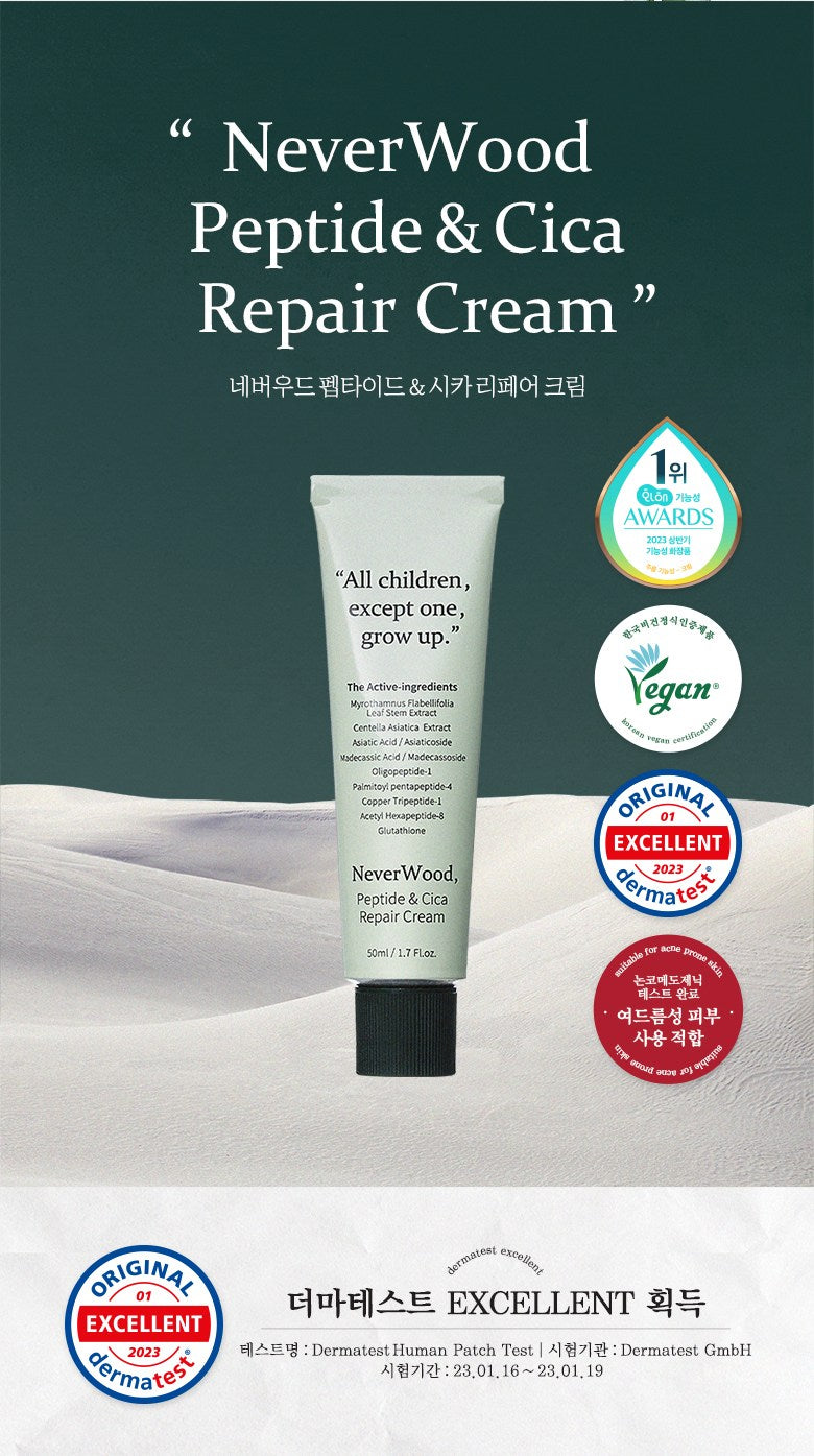 Experience the power of NeverWood Peptide & Cica Repair Cream, a dermatologist-tested formula that hydrates, firms, and soothes the skin. Awarded the DermaTest Excellent certification and Non-Comedogenic tested, this cream is perfect for sensitive and acne-prone skin.