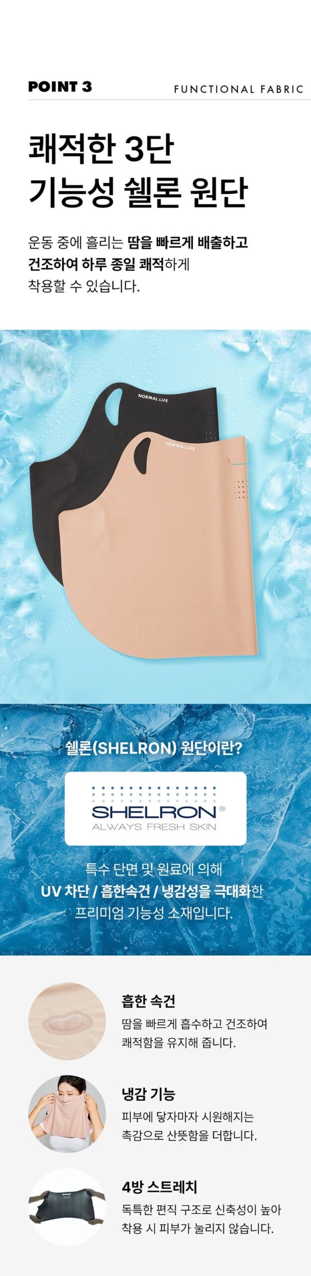 - SHELON Fabric: A premium material offering UV protection, sweat absorption, quick drying, and a cooling sensation upon contact. Its unique knitting structure provides elasticity without pressing against the skin.