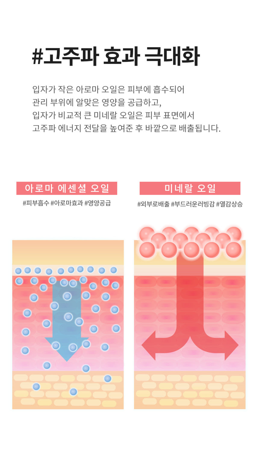 Aroma oil with small particles is absorbed into the skin and supplies appropriate nutrition to the care area, while mineral oil with relatively large particles enhances the transmission of high-frequency energy on the skin surface and is then discharged to the outside.