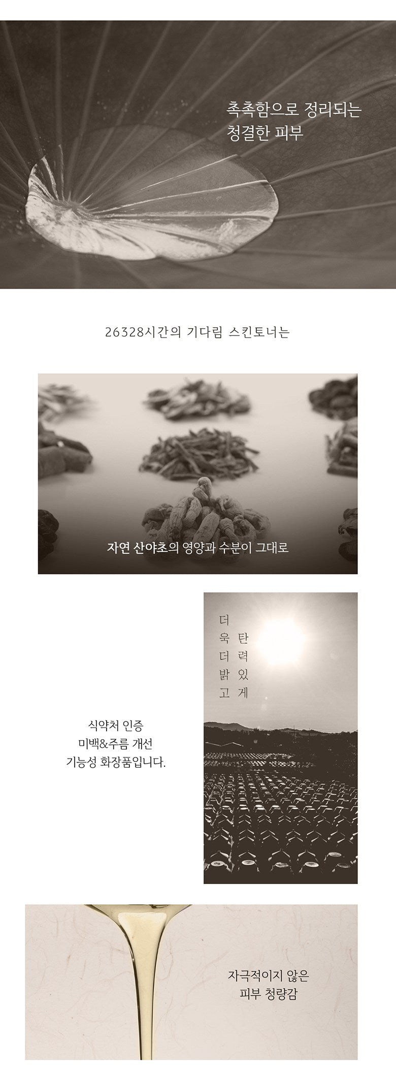 Our 26328-Hour Waiting Skin Toner is rich in nutrients and moisture derived from natural wild plants. Certified for its whitening and wrinkle-improvement properties by the Ministry of Food and Drug Safety, it provides a refreshing, non-irritating skin care experience.